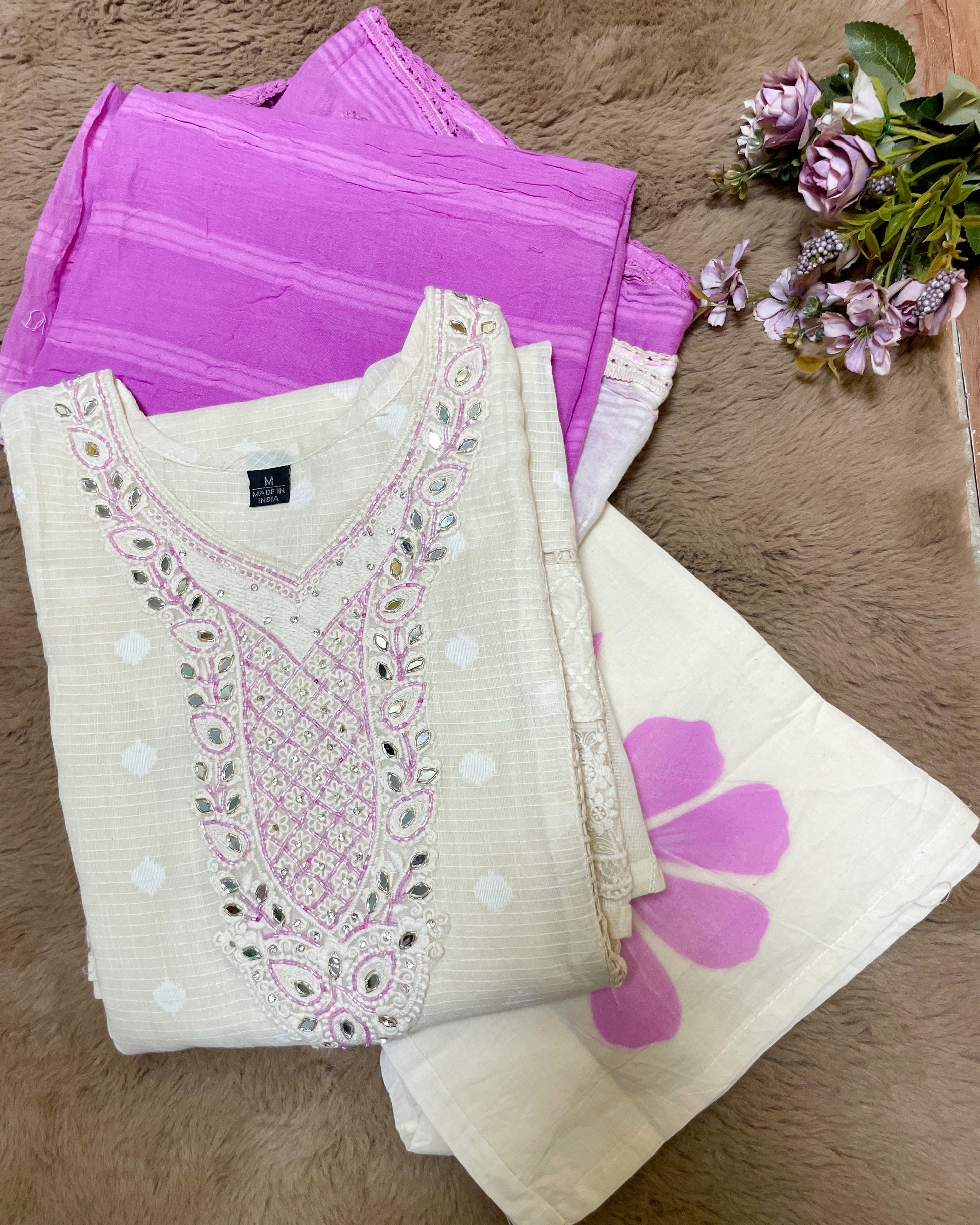 • Kurta: The top features a rich purple hue with dreamy brush-painted florals, elevated with intricate Chikankari scalloped detailing along the edges. The neckline sparkles subtly with delicate stone work, adding just the right amount of festive glam.