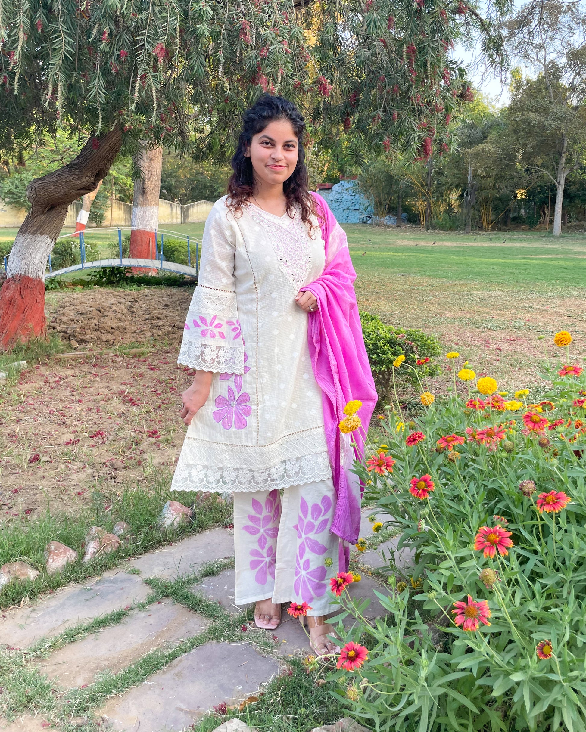 • Pants: The flared bottoms echo the brush-painted floral design, creating a graceful flow and artistic harmony with the kurta.