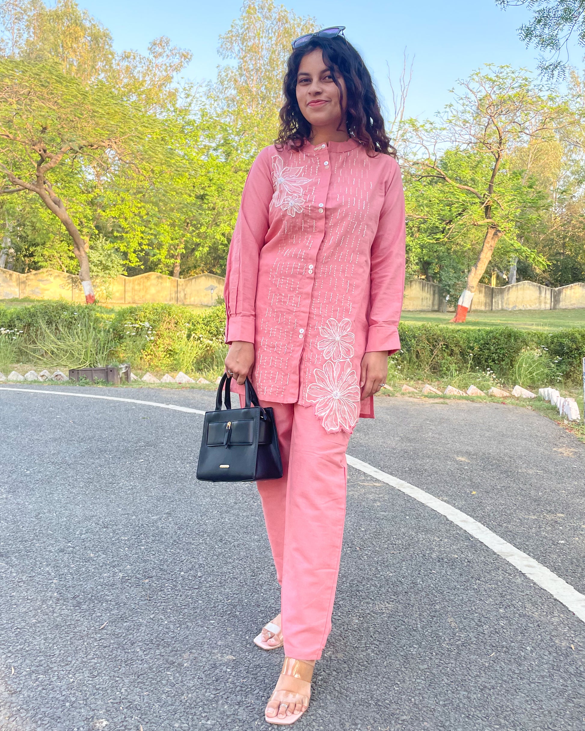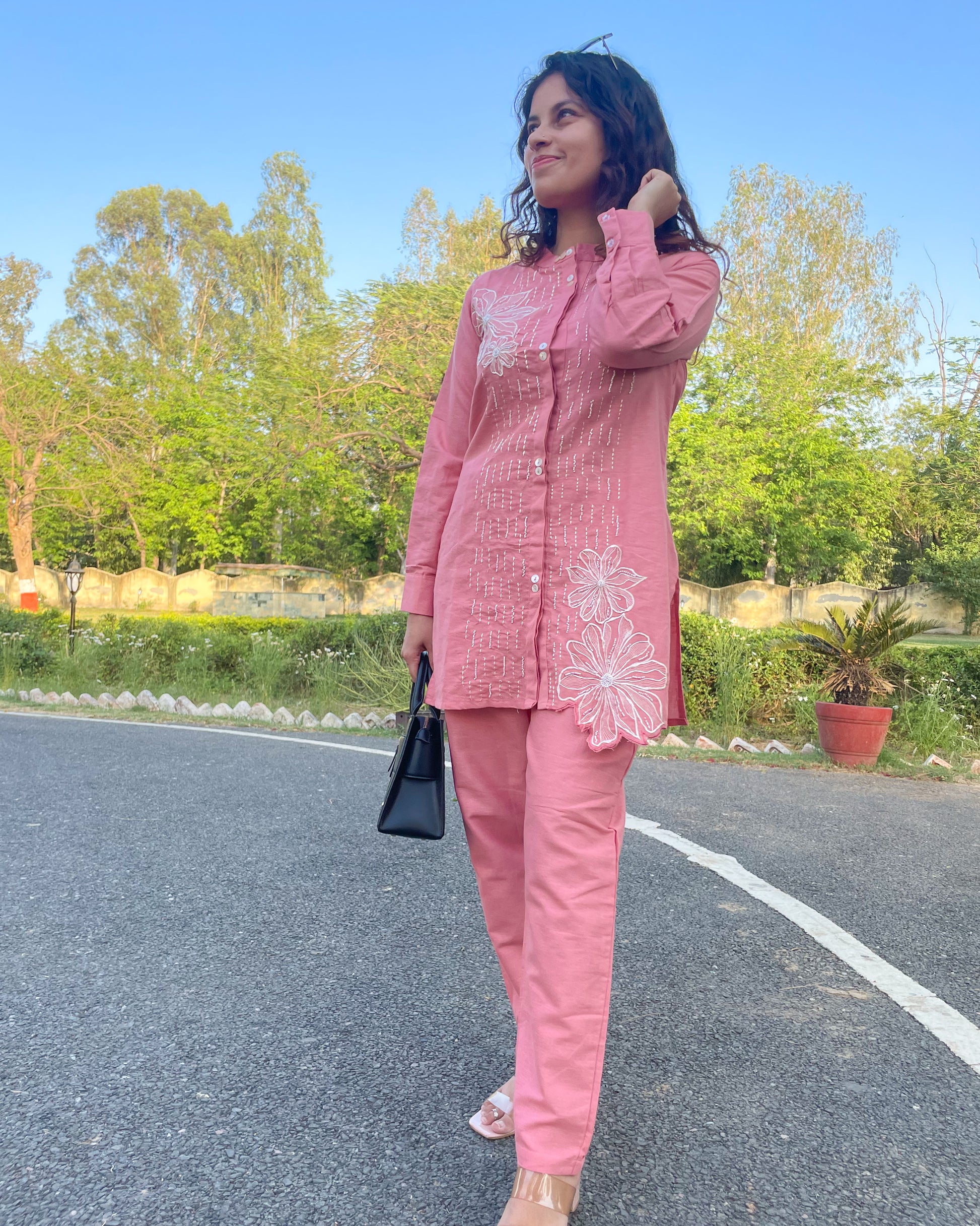 Soft yet statement-making, the Gulaabi Flower Co-ord Set is a celebration of refined elegance wrapped in delicate details—perfect for the modern woman who loves to blend grace with confidence.