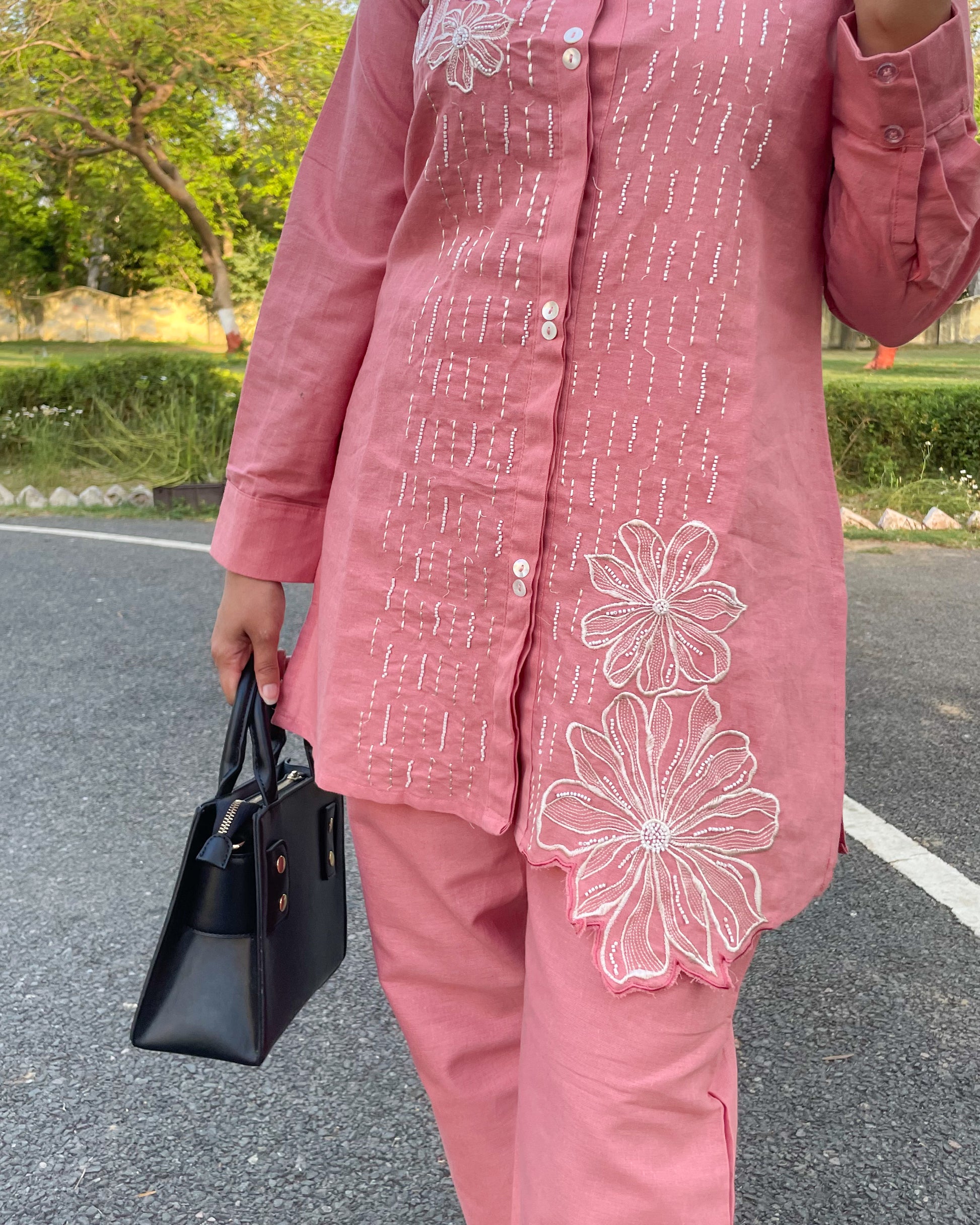 • Top: Designed in a graceful pink linen cotton, the top features intricate thread embroidery along with subtle pearl embellishments that add a hint of sparkle. The floral-inspired cutwork hem makes it truly unique, while the Nehru-style collar and button-down front lend a structured, smart look.