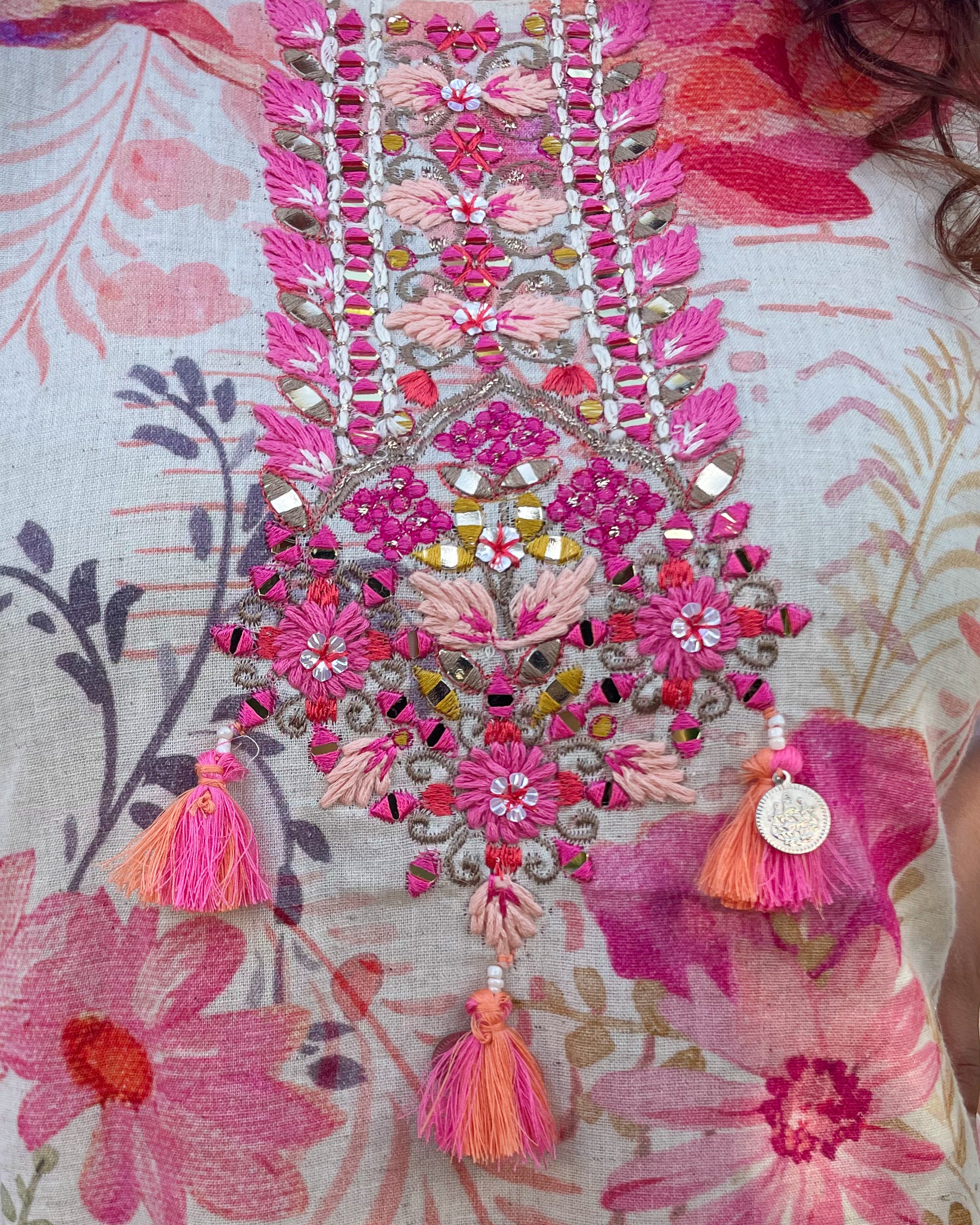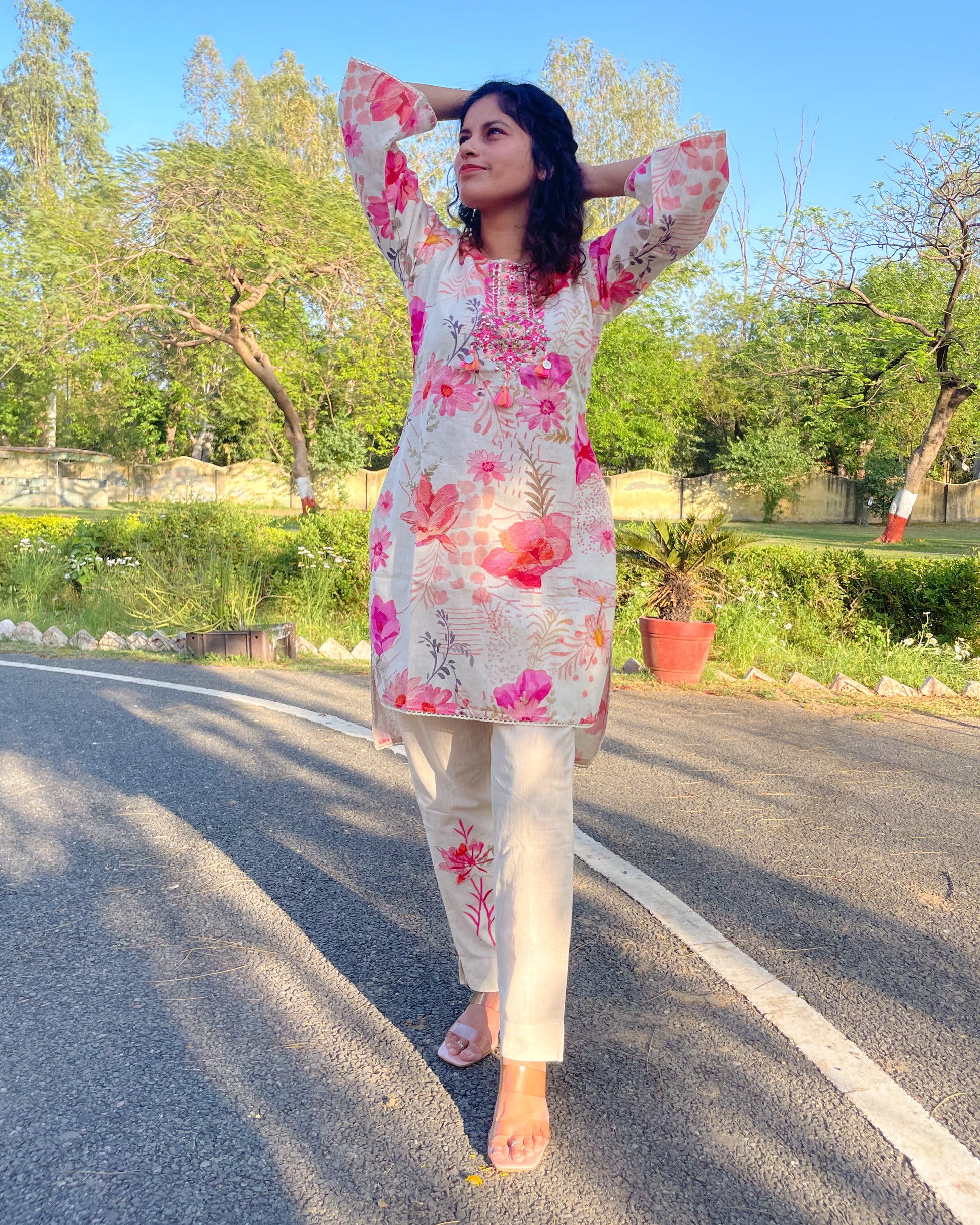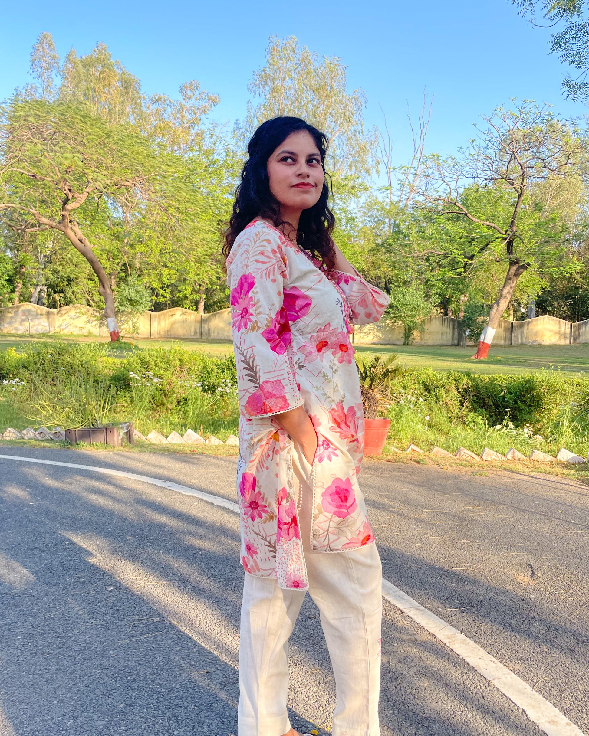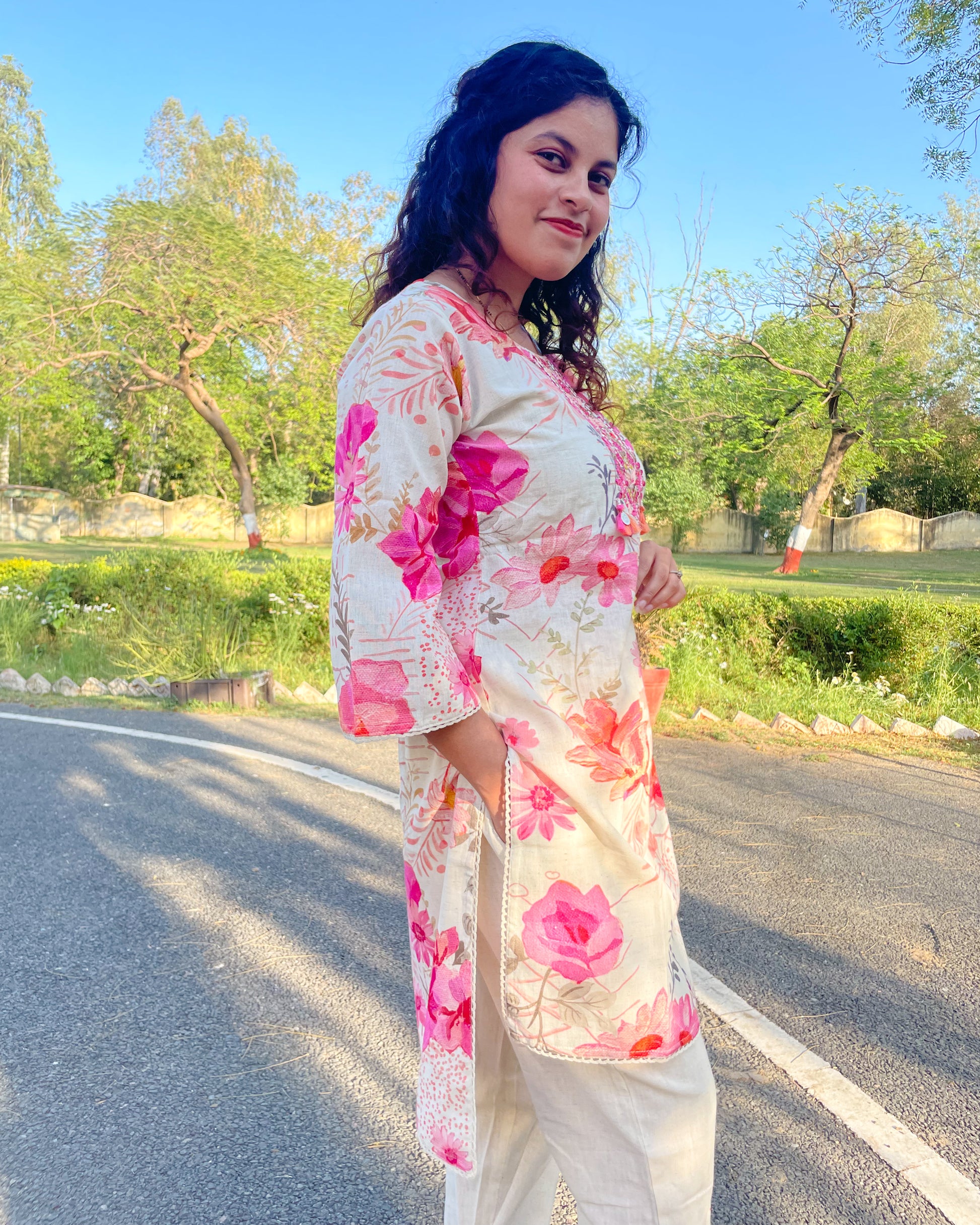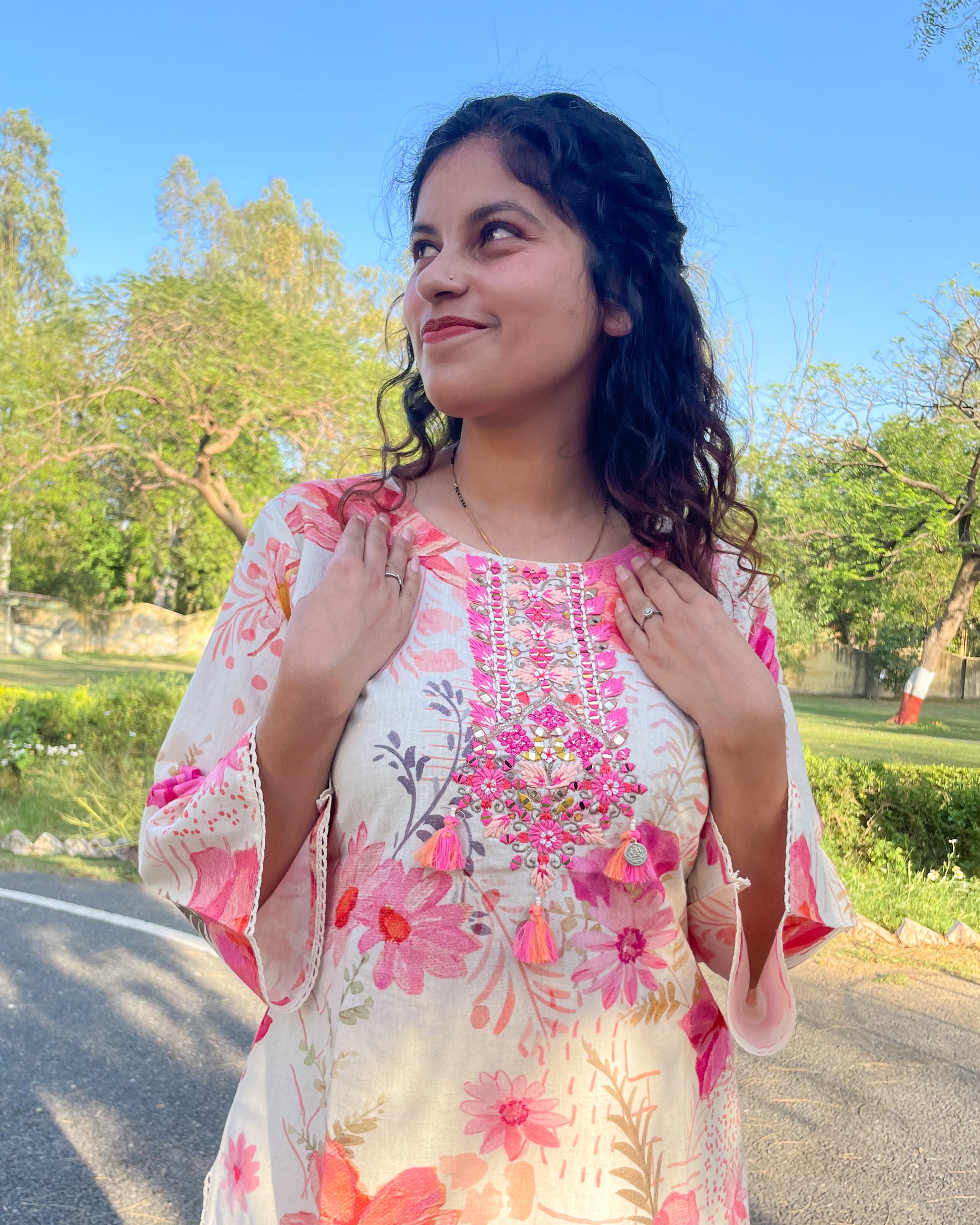 • Kurta: Crafted from lightweight linen-cotton, this ivory-hued kurta is adorned with delicate pink floral prints that bring a fresh, breezy feel. The neckline embroidery with playful tassels adds a touch of artisanal charm, while the bell sleeves are finished with intricate lace detailing, enhancing its feminine appeal. Designed with an asymmetric hemline—shorter in the front and longer at the back—it strikes the perfect balance between modern and traditional.
