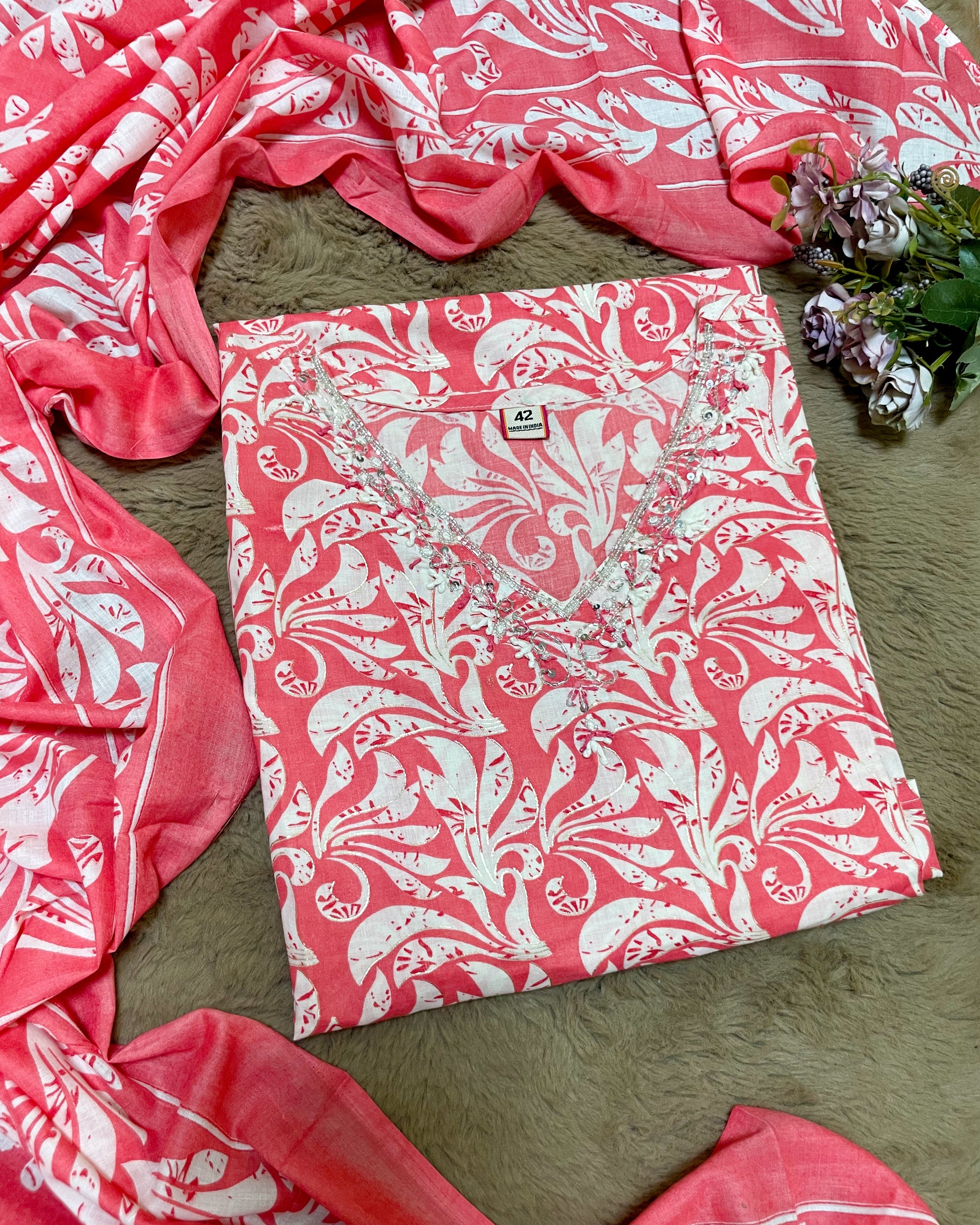• Kurta: Crafted in pure cotton, the kurta features a charming floral print that brings out a fresh, feminine vibe. The hand embroidery on the neckline adds a touch of craftsmanship and sophistication, making it perfect for those who appreciate the finer things.