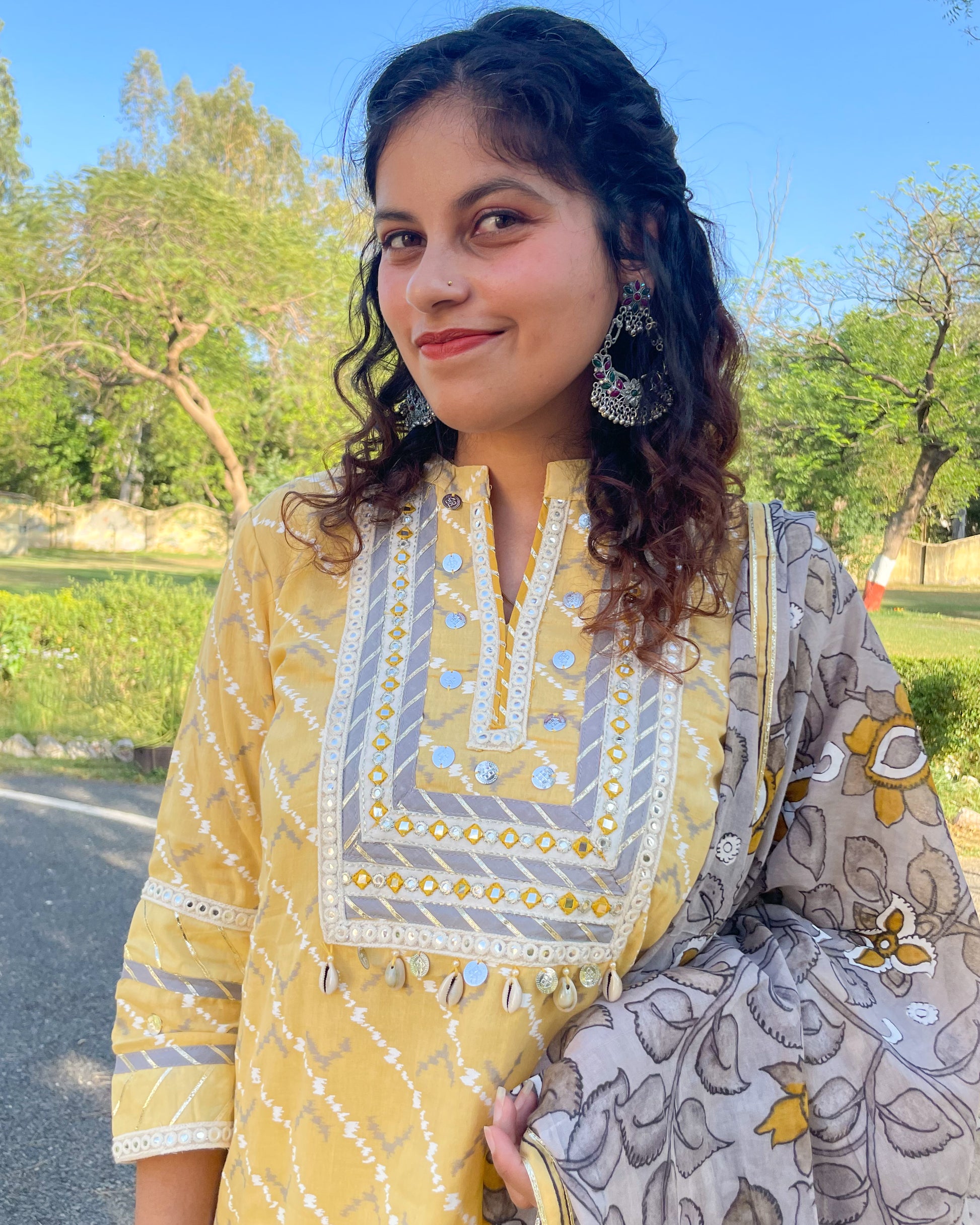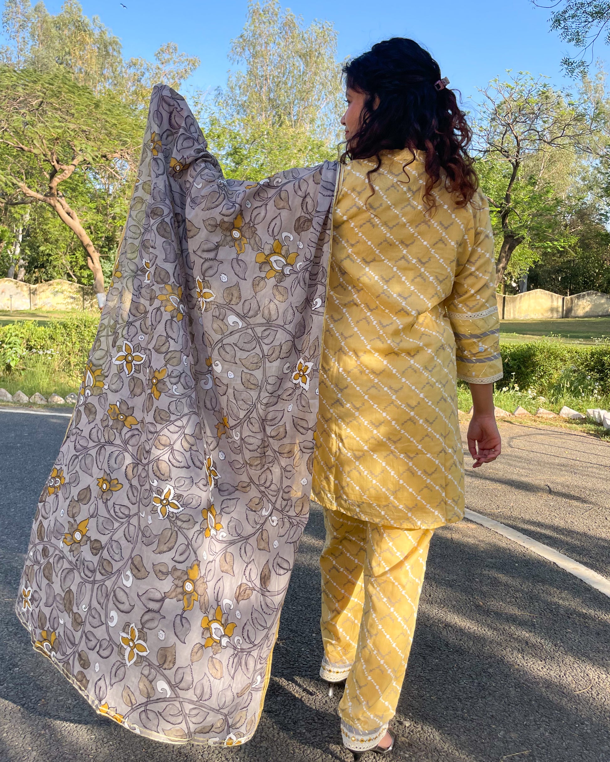 ✔ Color: Mustard Yellow (Kurti & Pants) | Grey-Black (Dupatta)