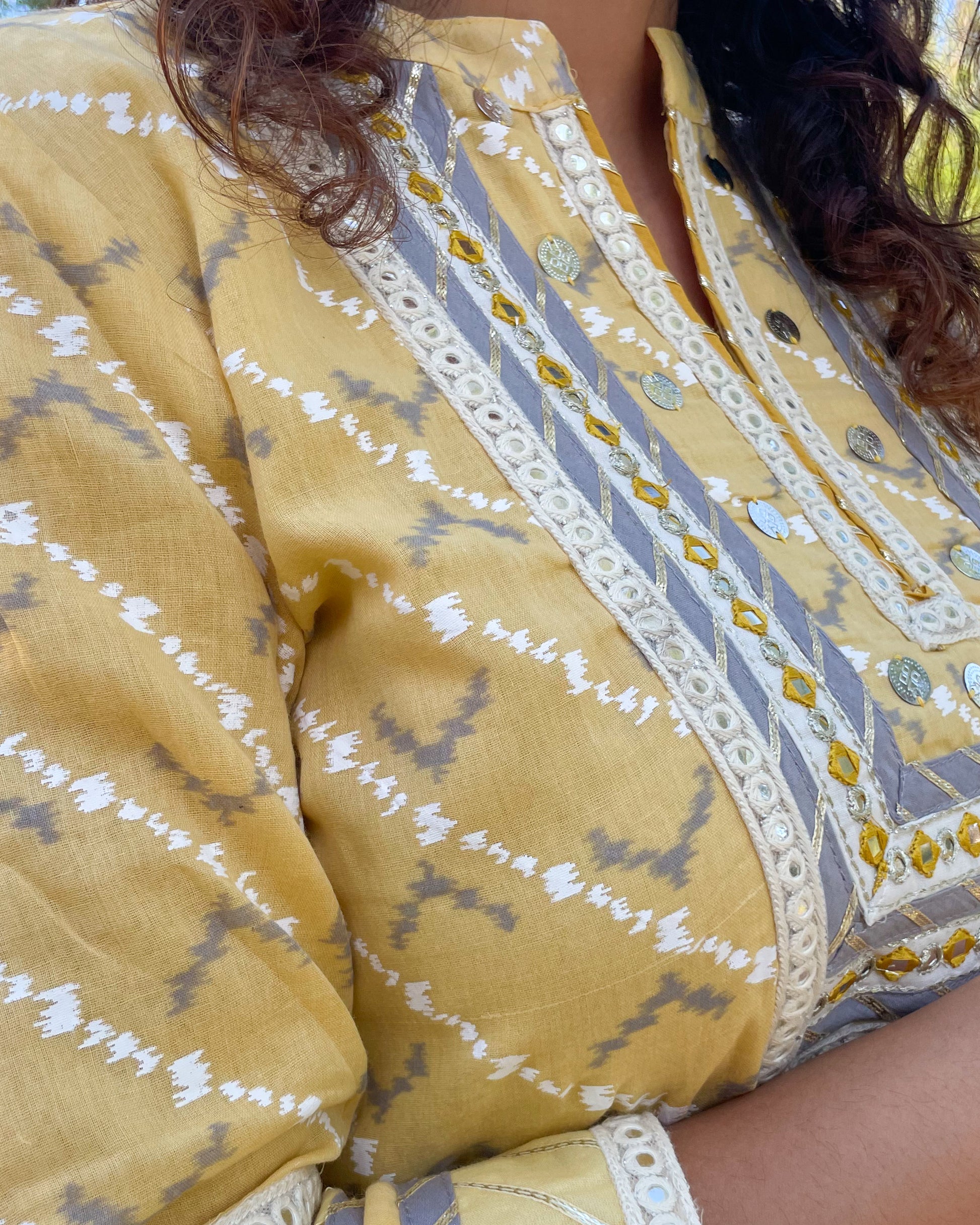 • Kurti: Crafted from premium mul cotton, the short kurti comes in a radiant mustard yellow hue, featuring delicate embroidery and statement tassels at the neckline. Subtle detailing on the sleeve edges adds a refined touch, making it a standout piece.