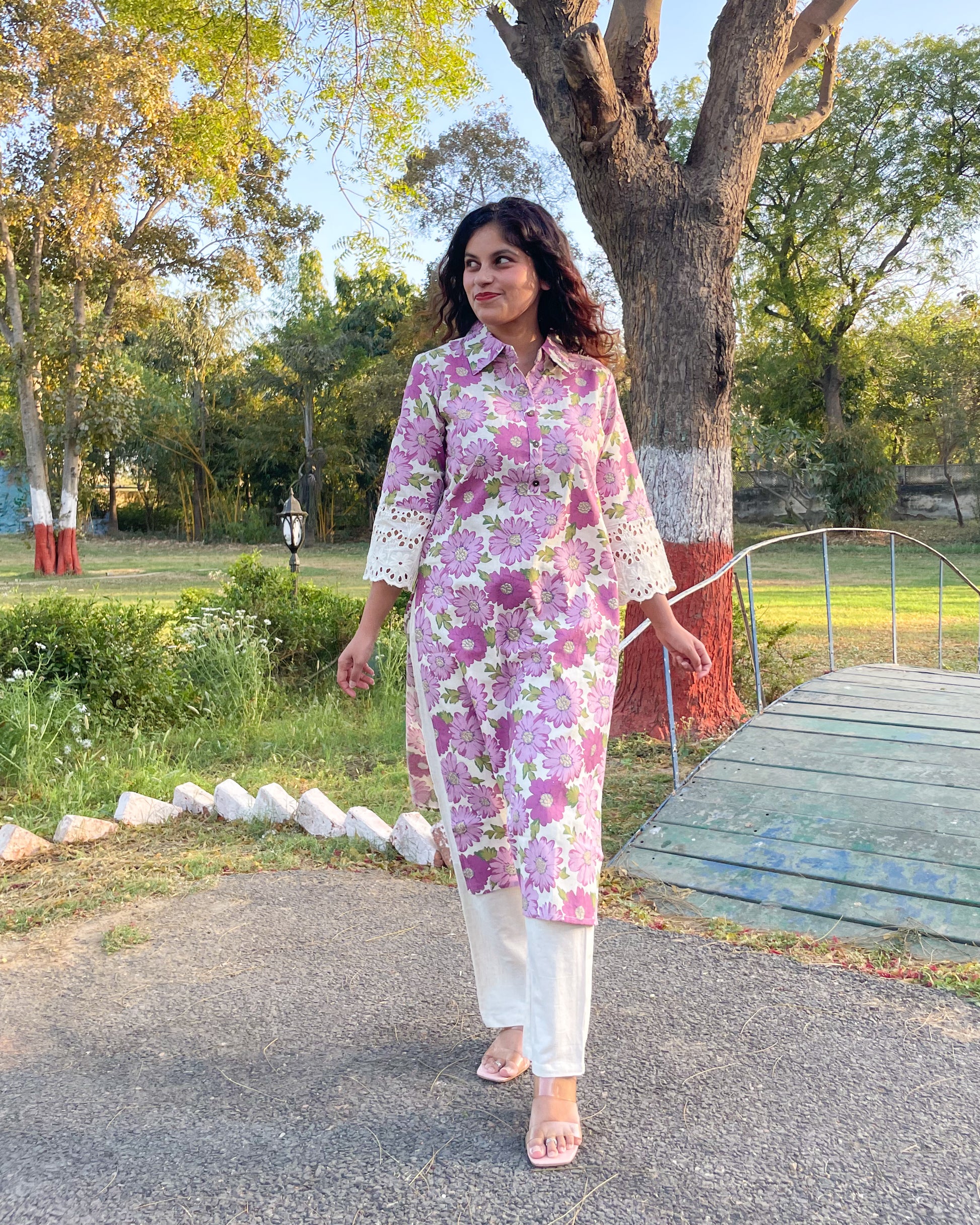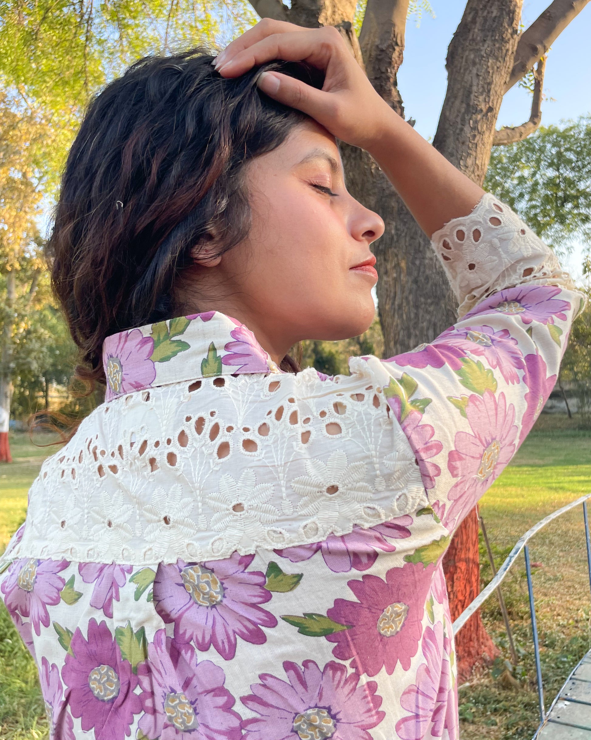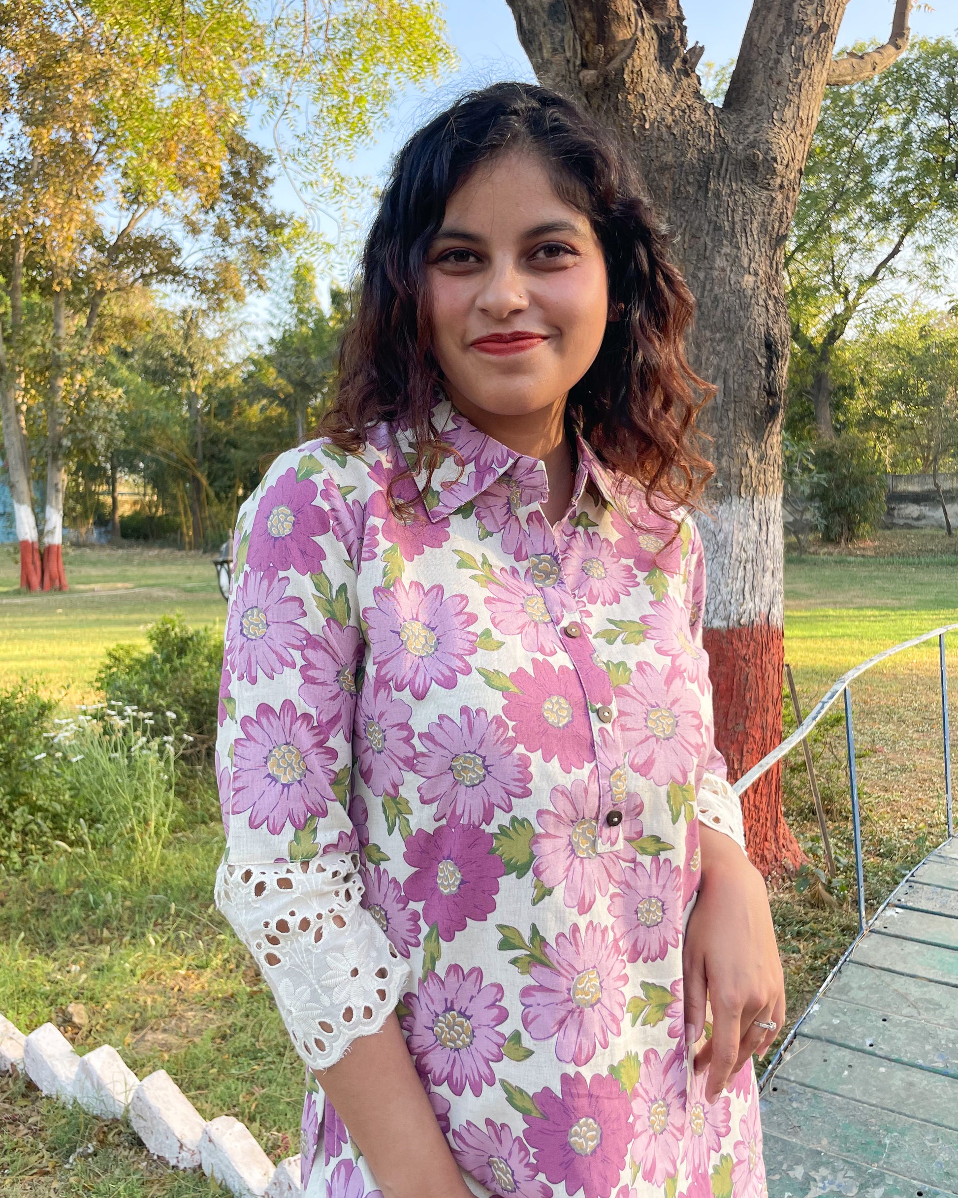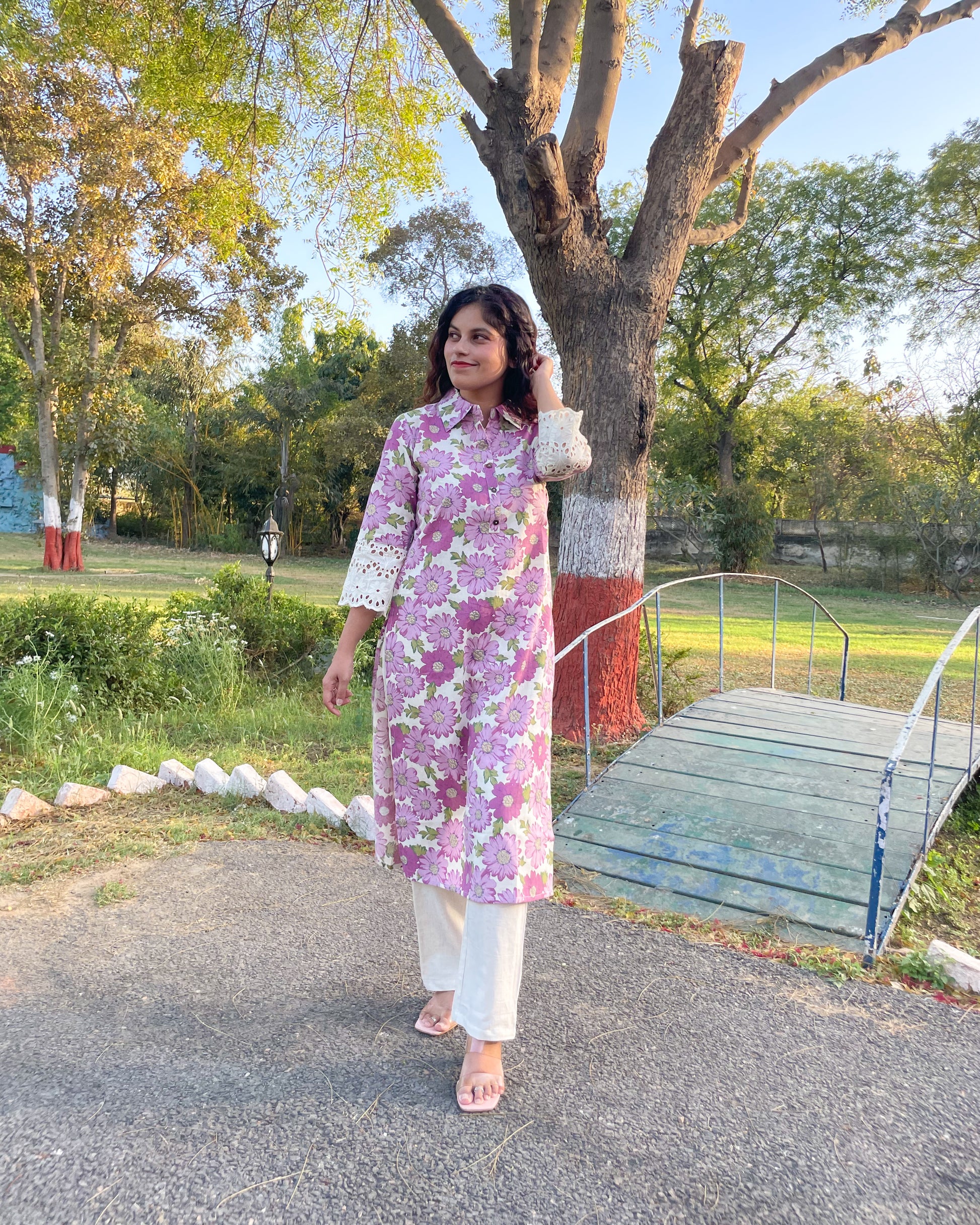• Kurta: Designed in a refreshing ivory base adorned with delicate floral prints, this kurta offers a chic yet graceful aesthetic. The front button detailing (for a structured look) and classic collars add a refined touch, making it ideal for office wear. The sleeves and the back neckline feature intricate Chikankari lacework, bringing in a subtle, handcrafted charm.