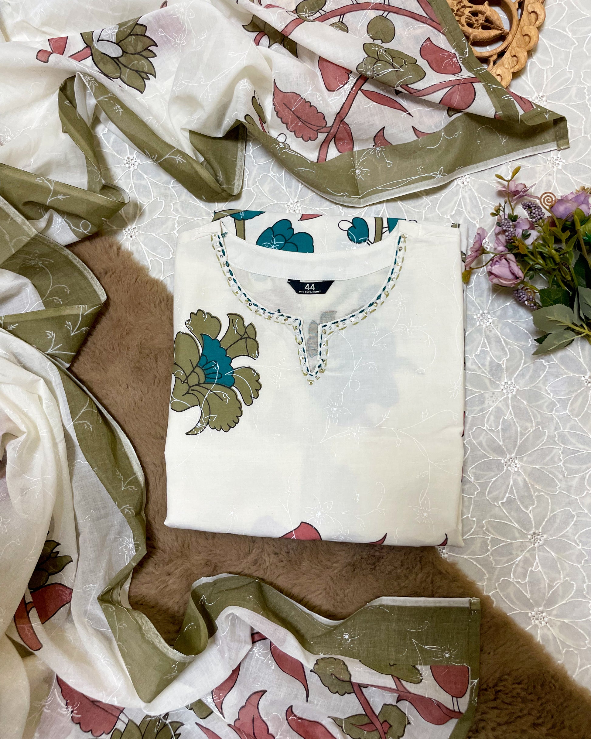 ✔ Top: Printed cotton kurta with minimal kantha thread work on neckline