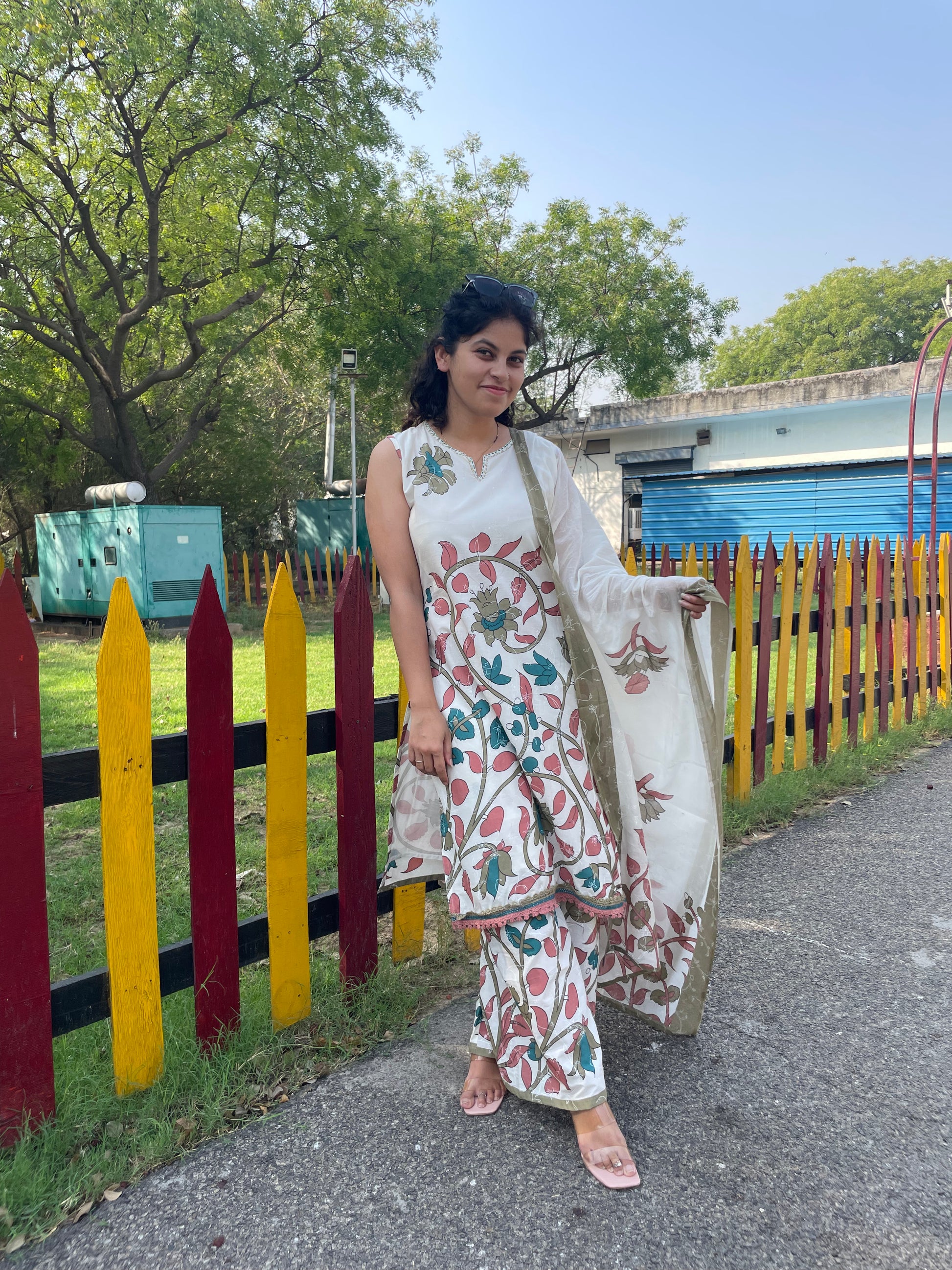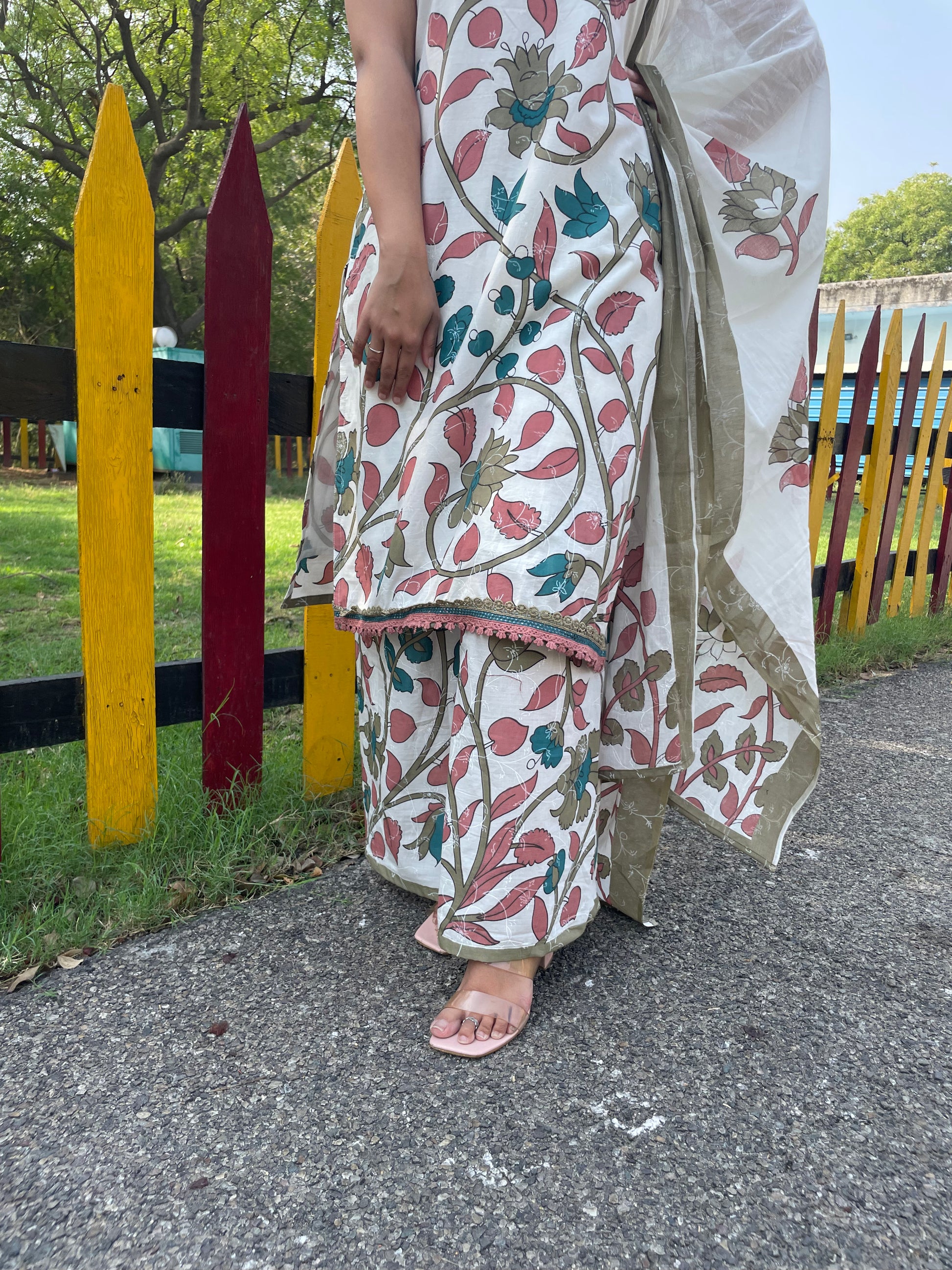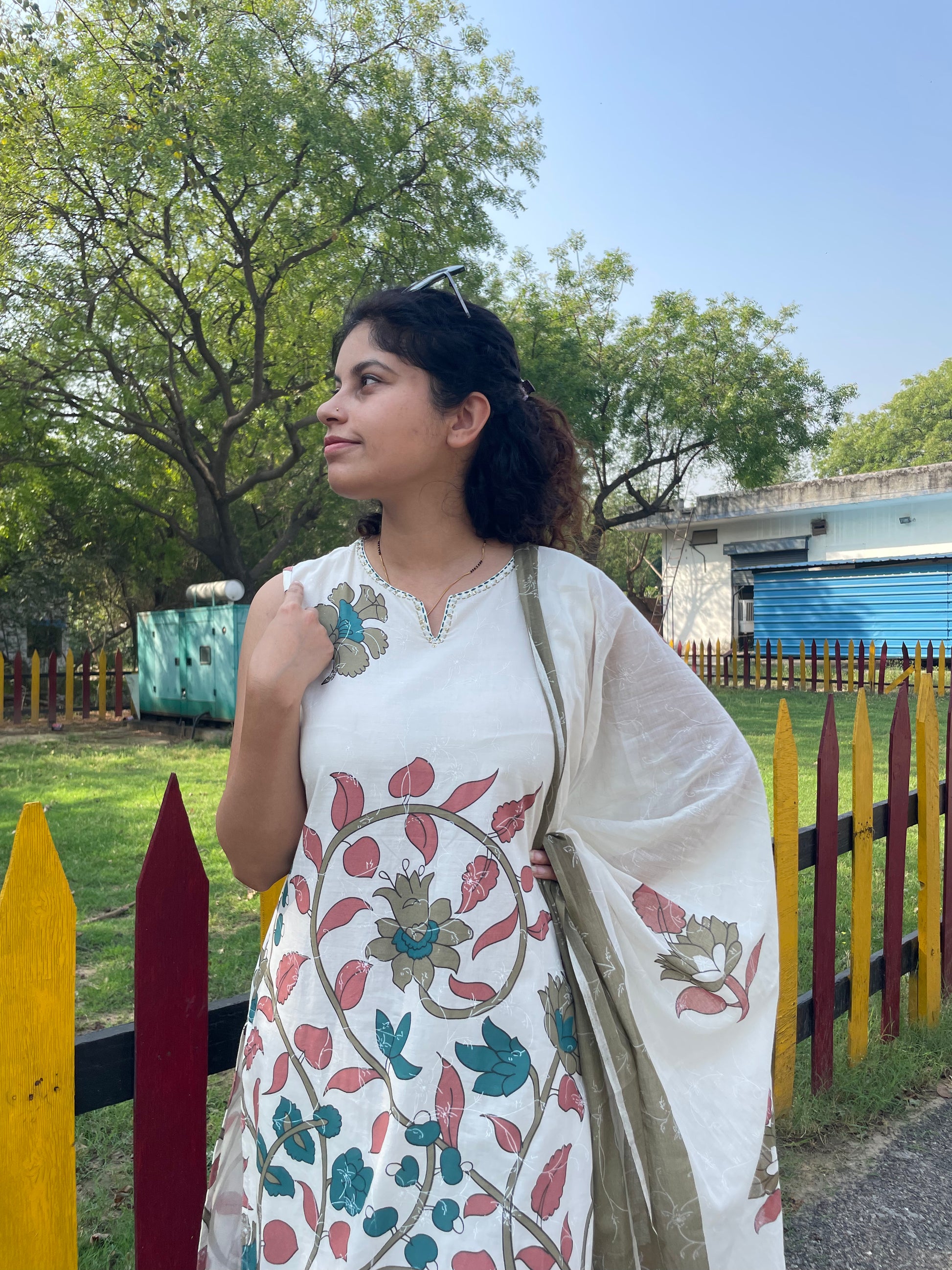 • Kurta: Made in soft, breathable cotton, the kurta features charming all-over prints and is accented with minimal kantha-style thread detailing on the neckline—subtle yet refined.
