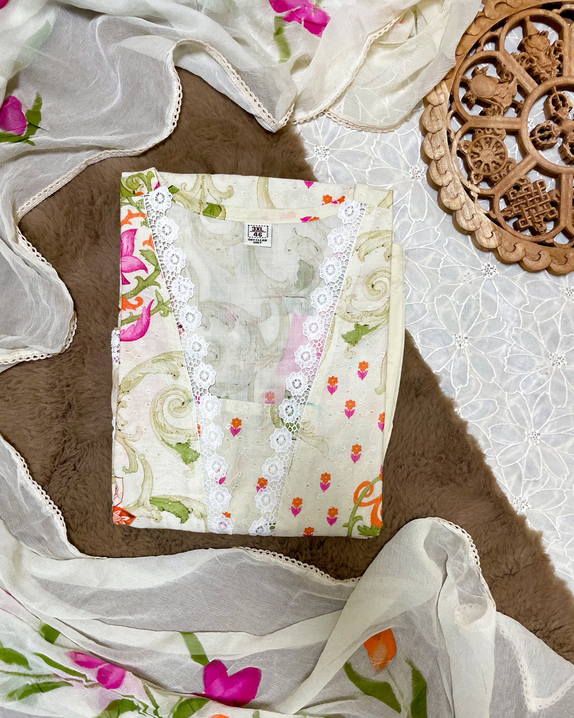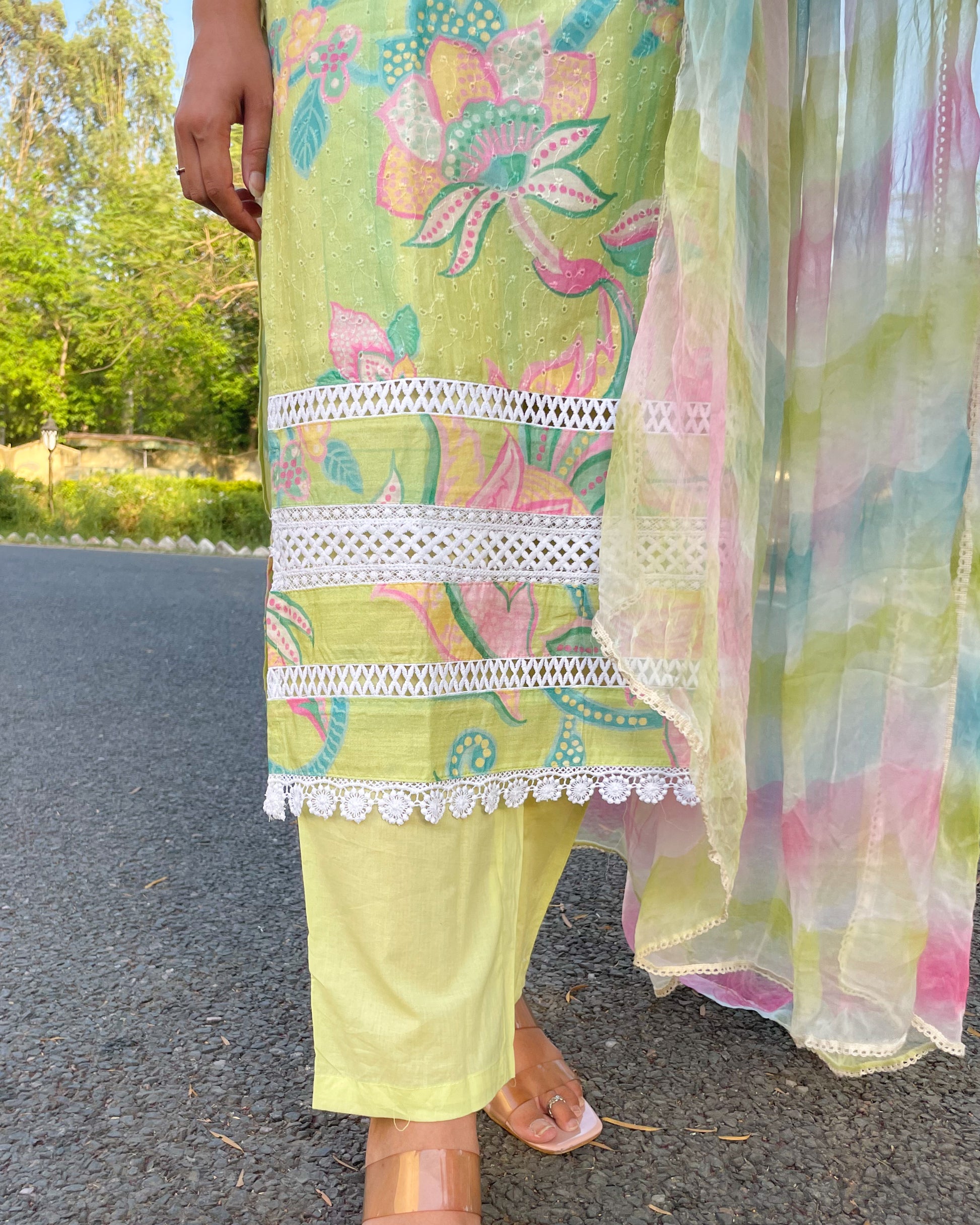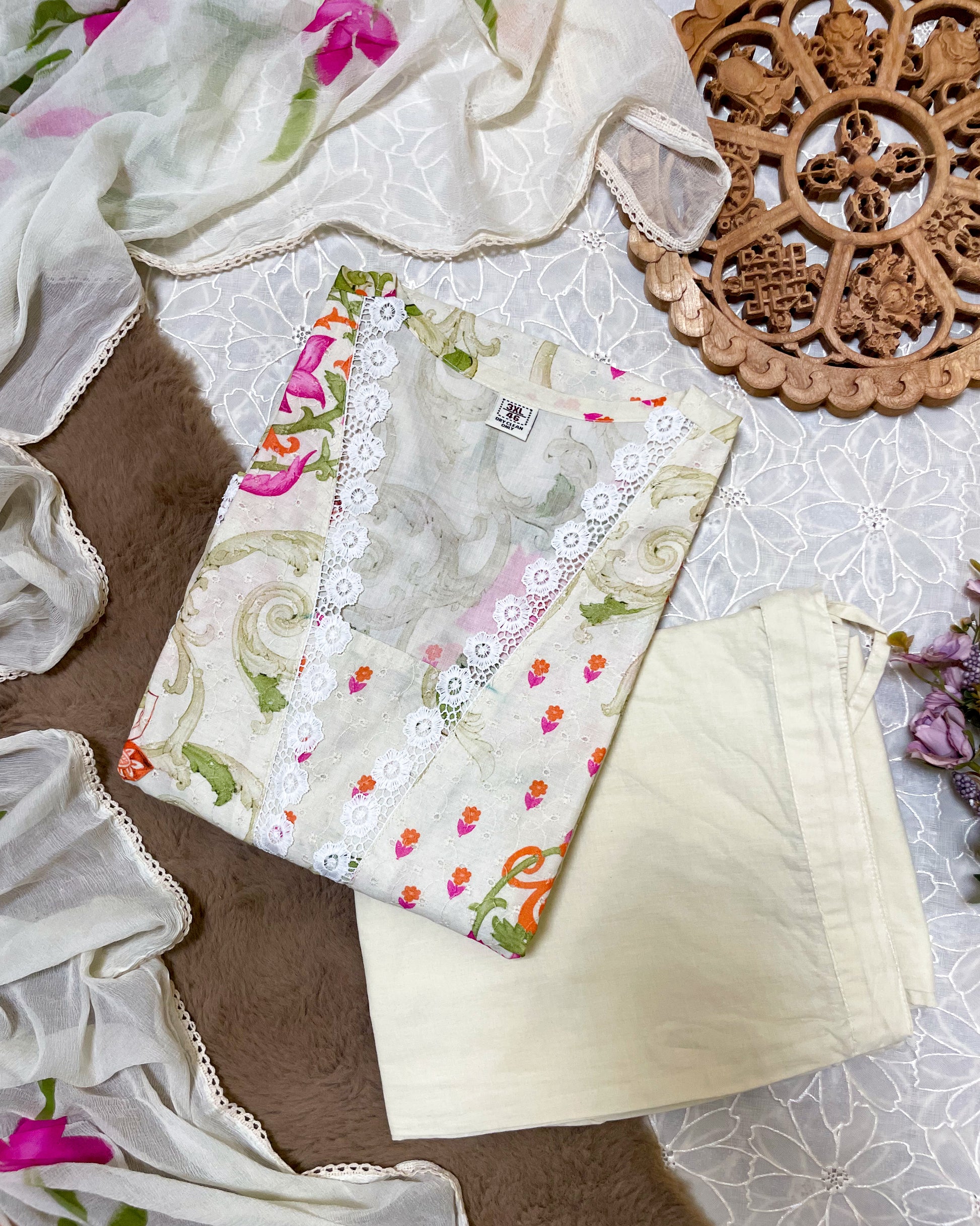 • Kurta: Made from pure cotton, the kurta is adorned with schiffli embroidery and soft prints, creating a harmonious blend of texture and pattern. Thoughtfully finished with lace detailing on the neckline, sleeves, and hem, it adds a romantic touch to this summery silhouette.
