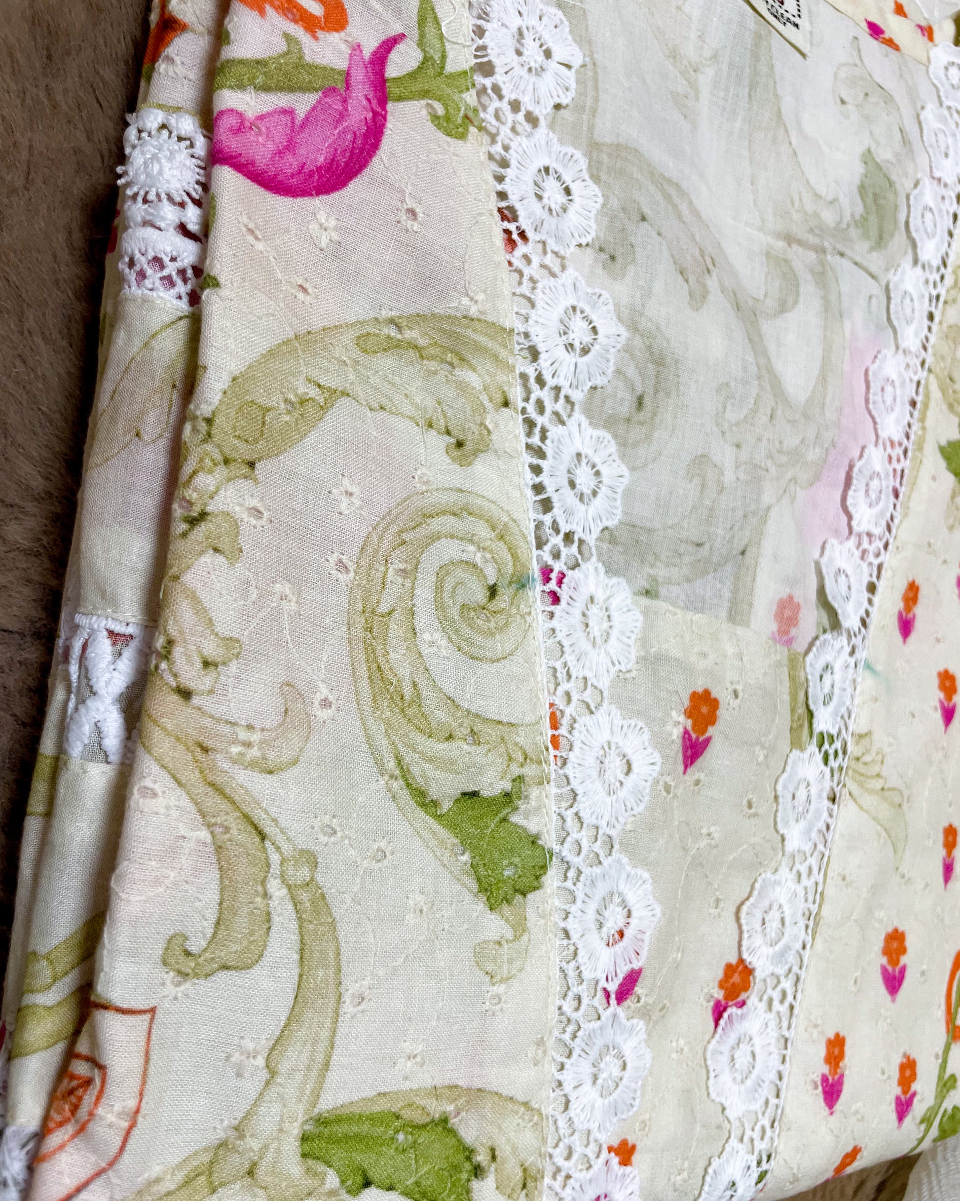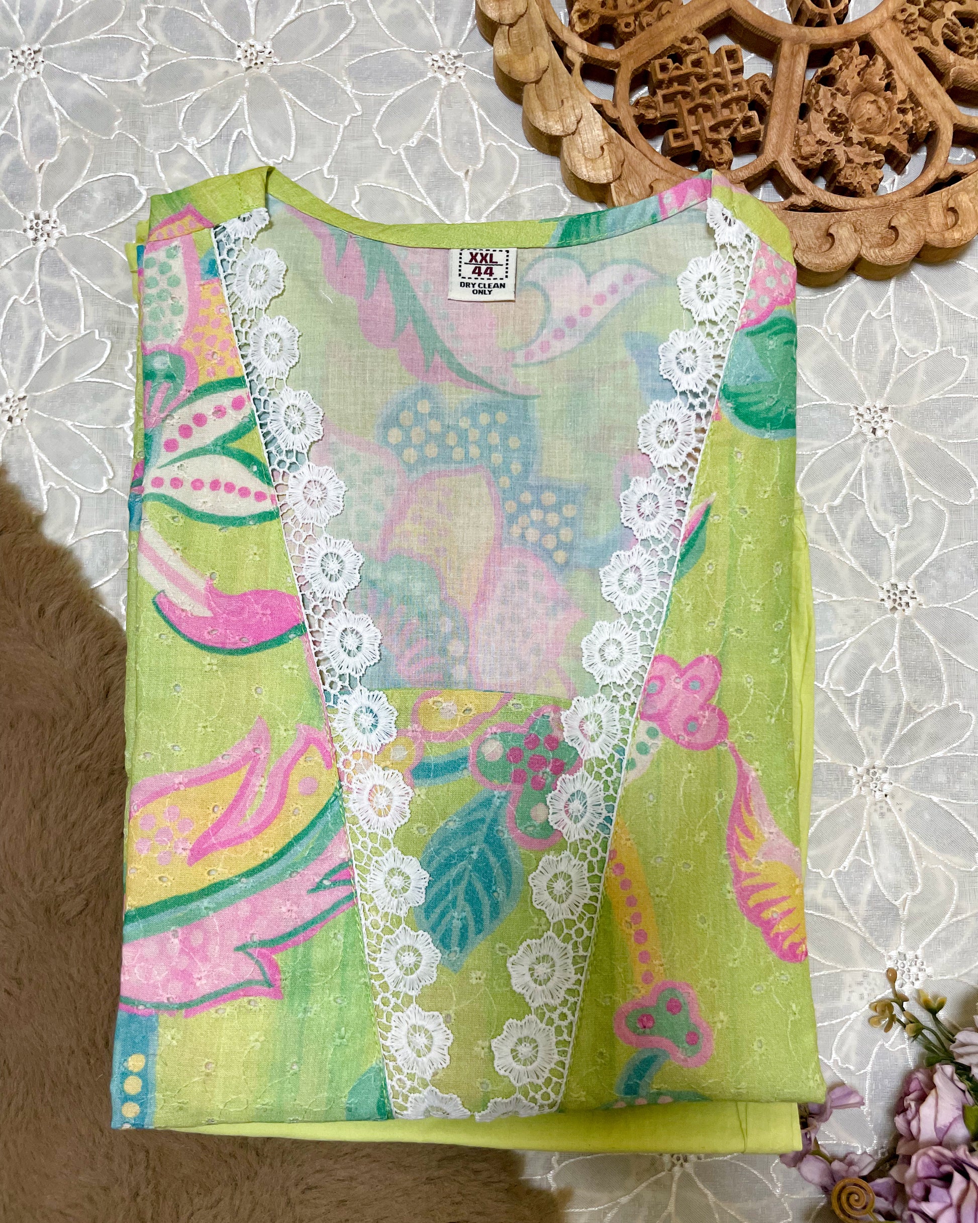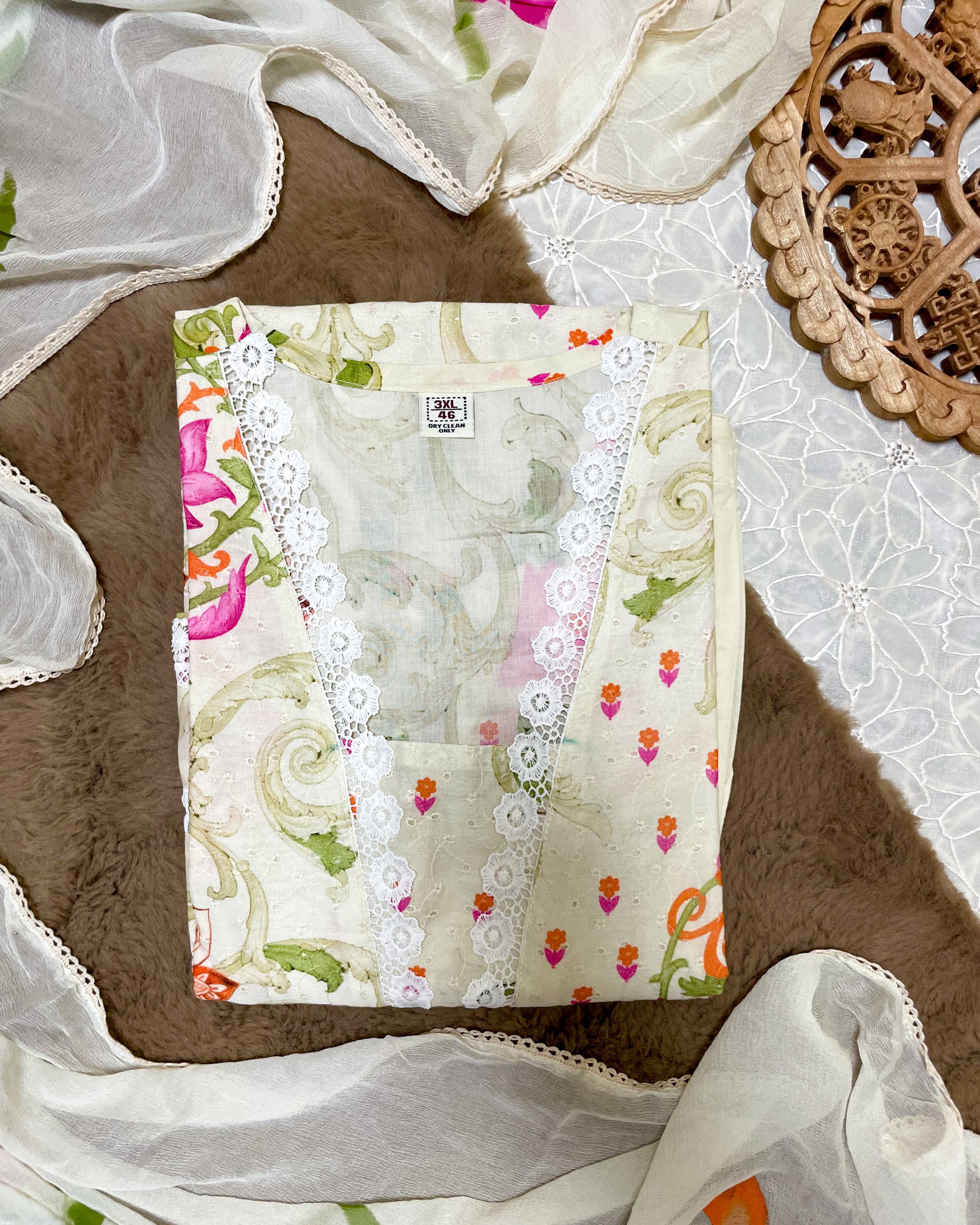 ✔ Top: Schiffli-embroidered kurta with lace detailing and prints