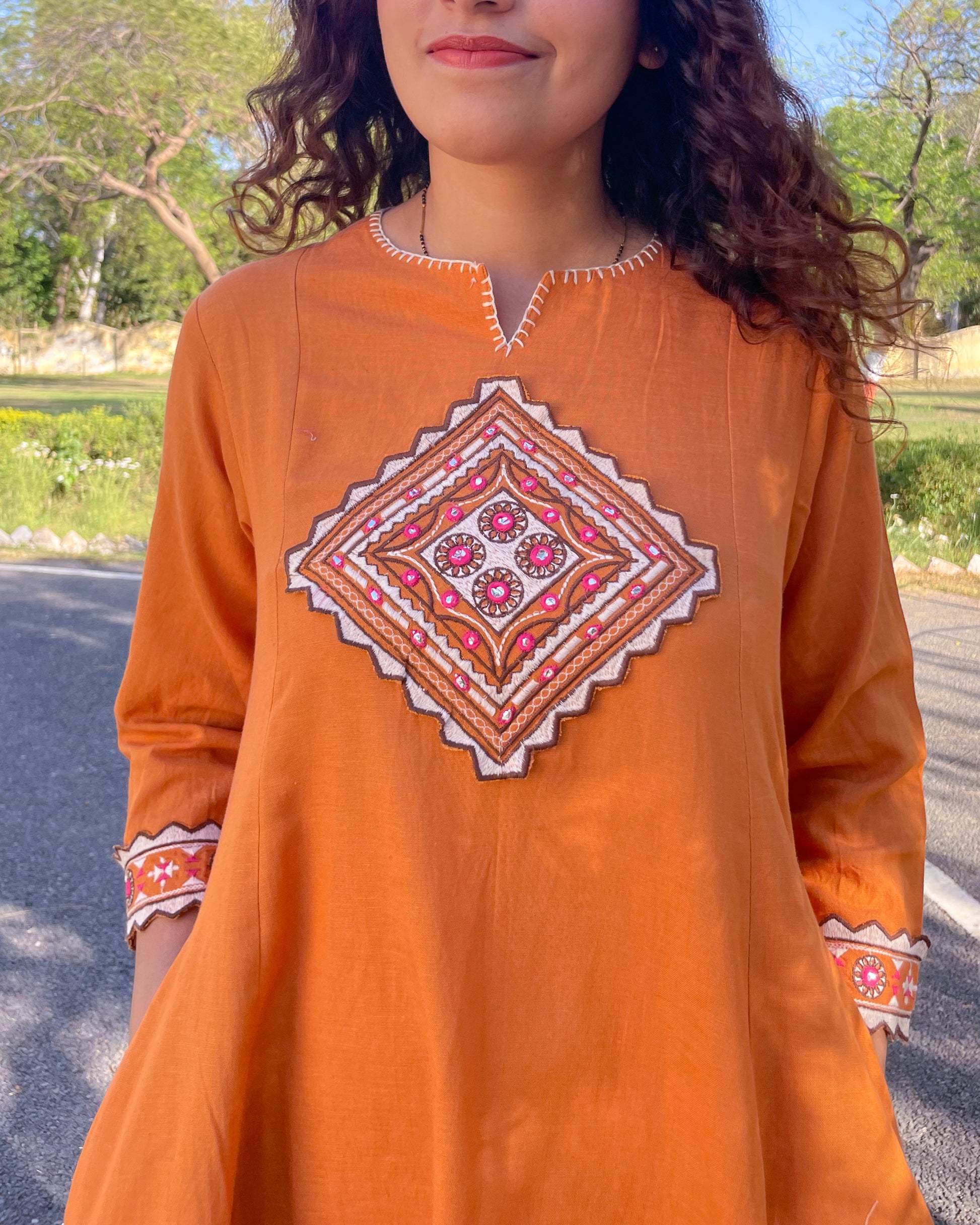 ✔ Embellishments: Patchwork embroidery on the neckline, embroidered sleeve border