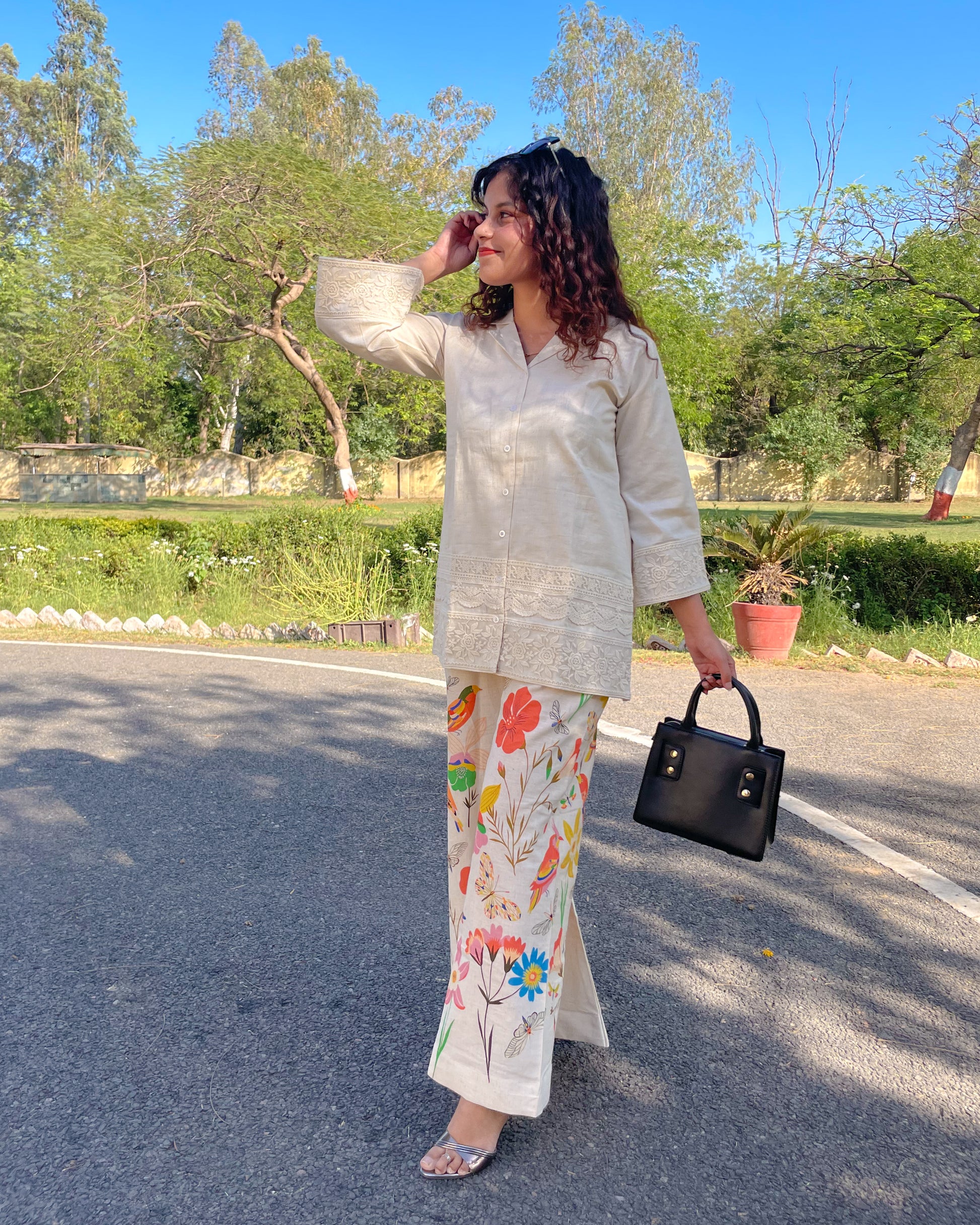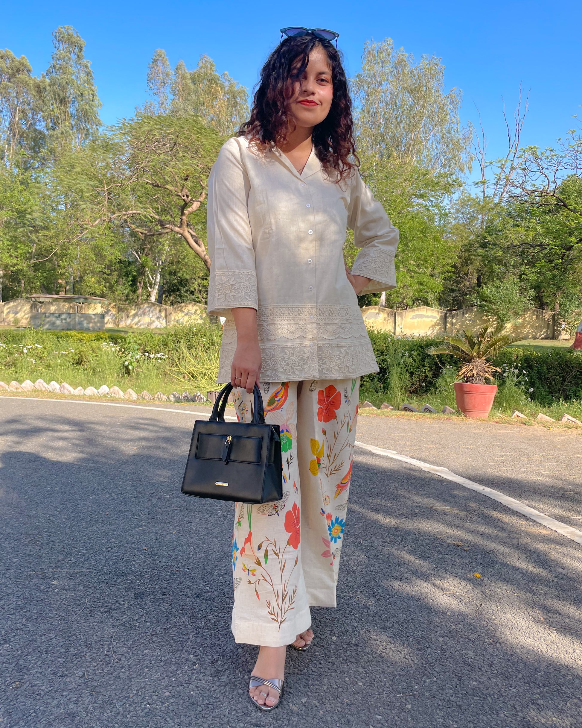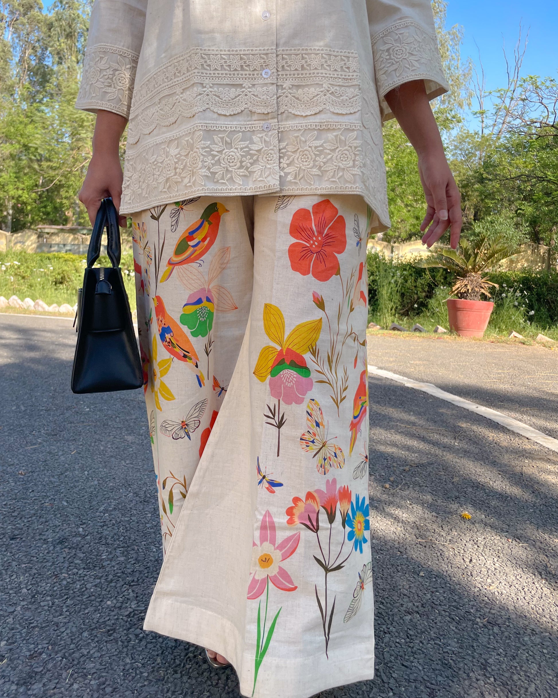 ๐ธ Bottom: In contrast to the understated top, the flared palazzo bursts with color, adorned with vibrant floral patterns that bring a refreshing, lively touch to the ensemble. Designed for comfort and movement, itโs perfect for effortless styling.