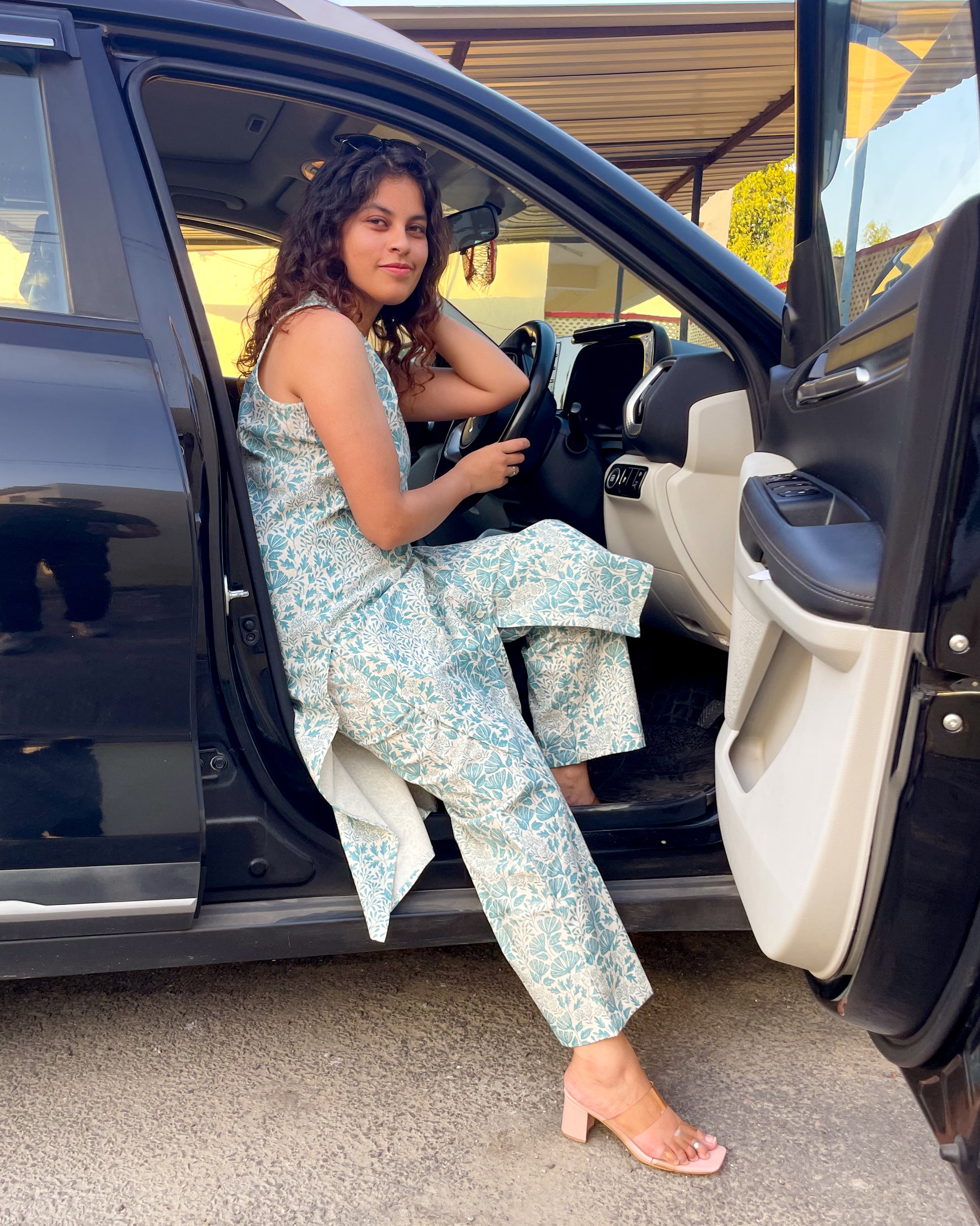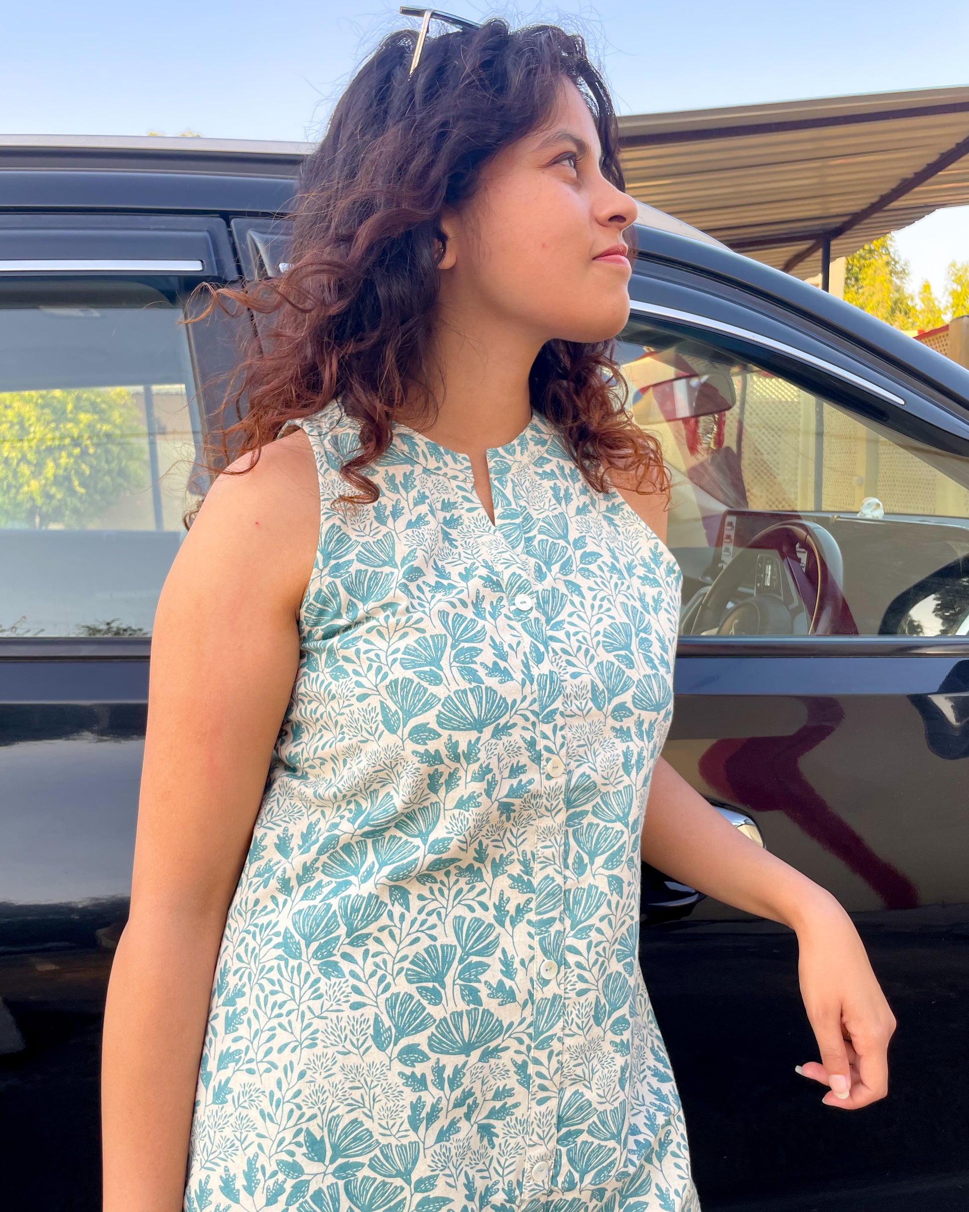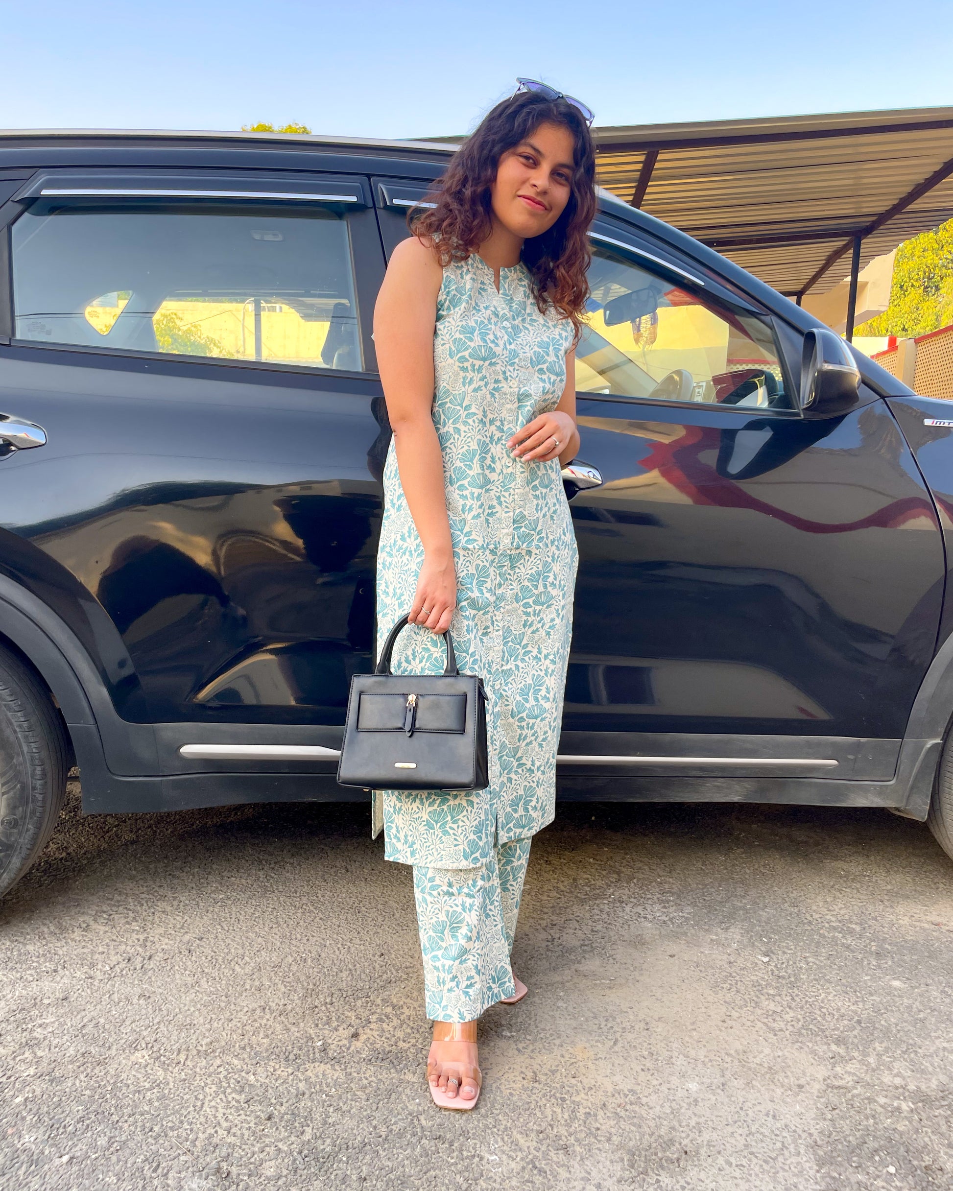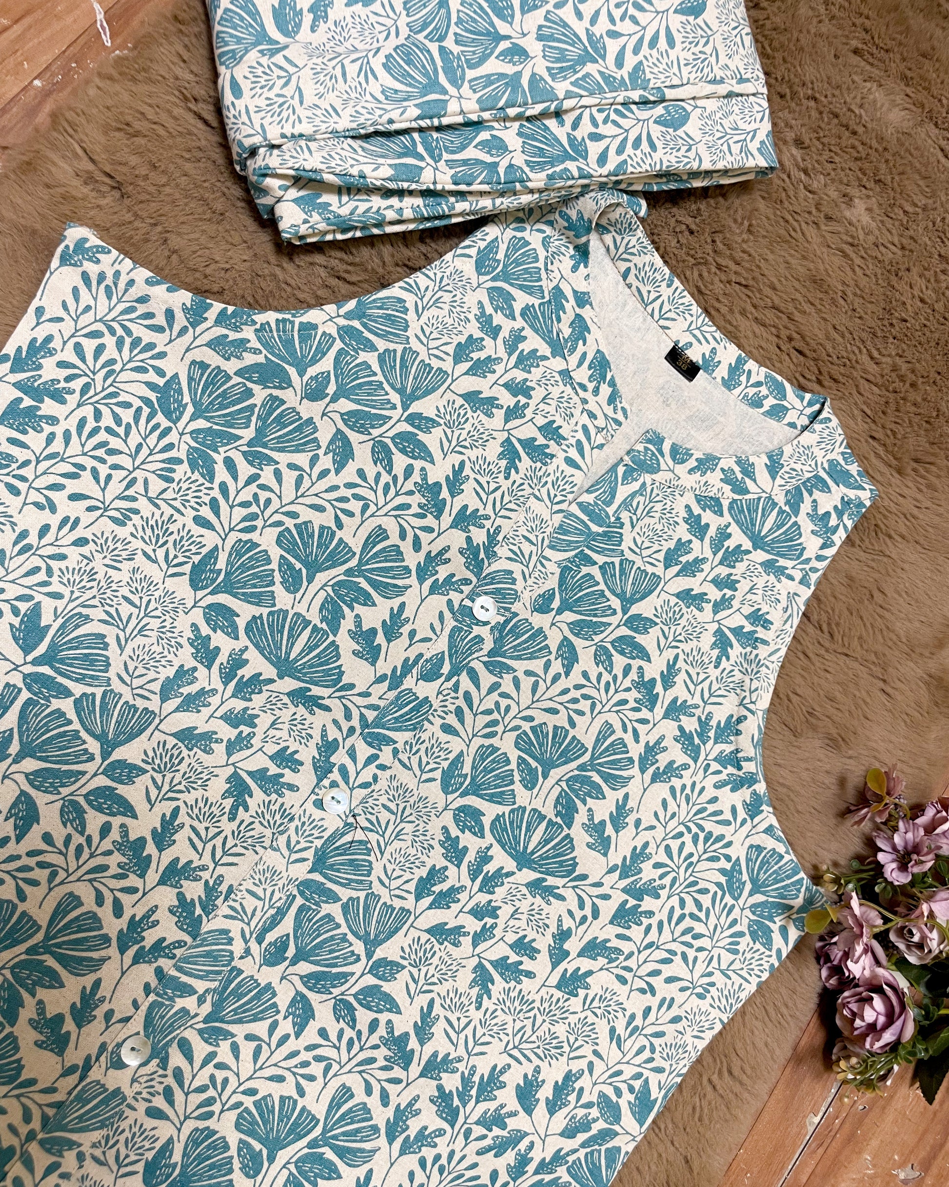• Kurta: Designed in a long, straight silhouette, this sleeveless kurta features delicate all-over prints that exude a soft, understated charm. The button-down style in the front adds a contemporary touch but remains closed—purely for style.