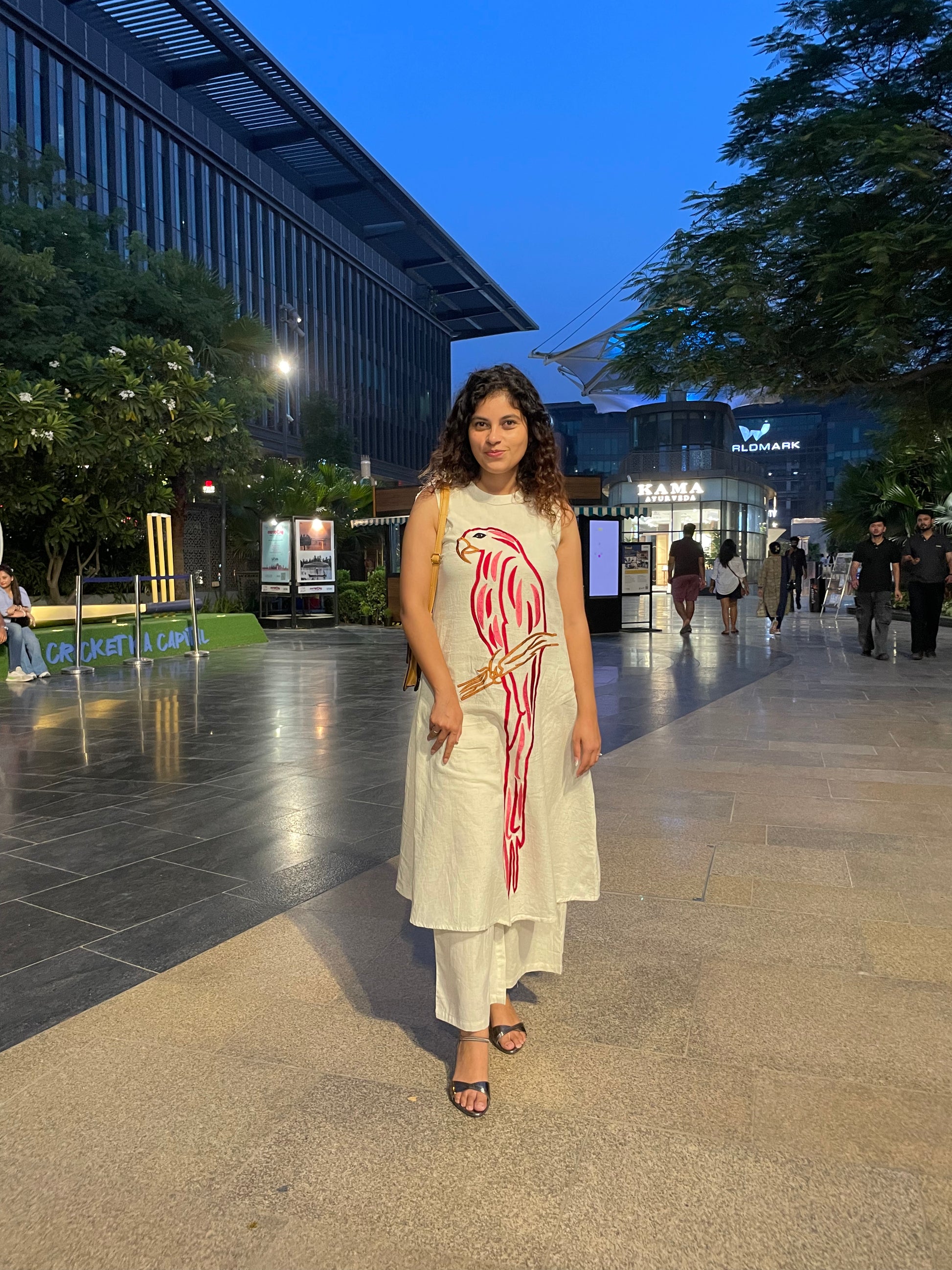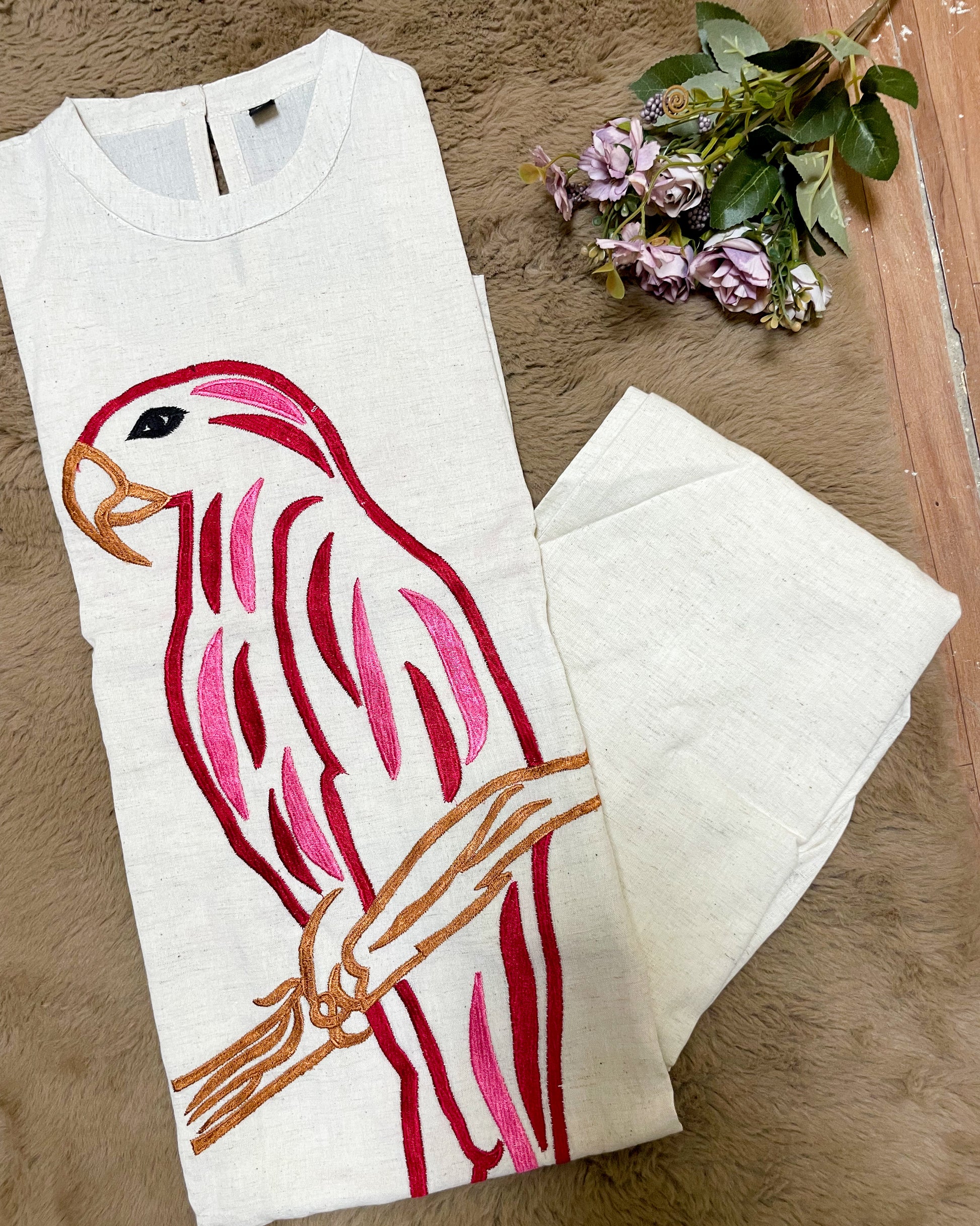 • Kurta: Crafted in pure white linen cotton, the sleeveless A-line kurta becomes a statement piece with its charming multicolored parrot embroidery on the front. The design is playful yet elegant, making it perfect for all-day wear. Optional sleeves are provided inside for versatile styling.