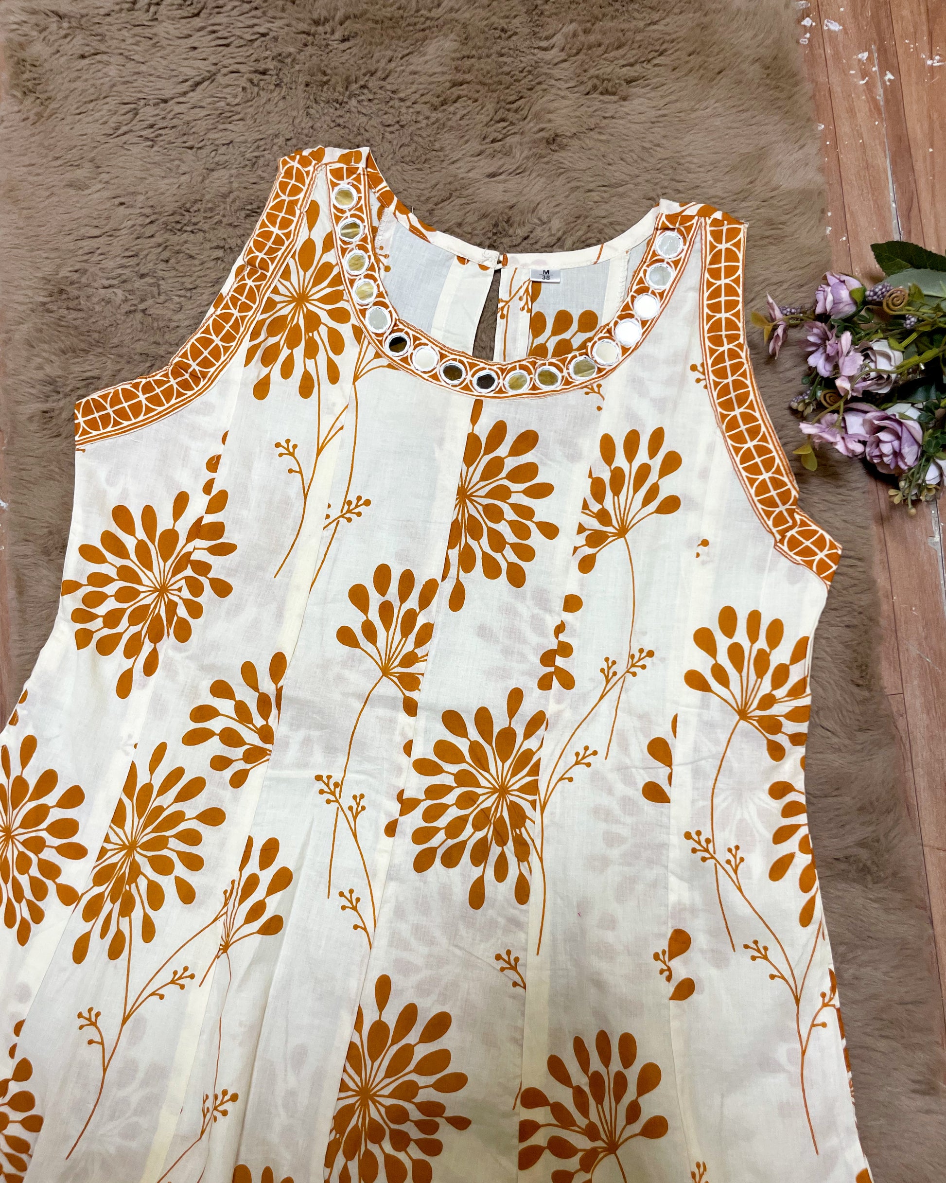 • Kurta: Crafted in pure cotton, this sleeveless A-line kurta features a beautiful all-over print that’s both subtle and stylish. The highlight? A delicately crafted real mirror work neckline that adds just the right touch of shimmer without overpowering the look.
